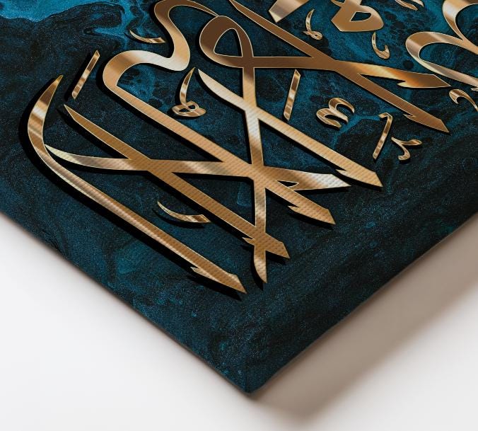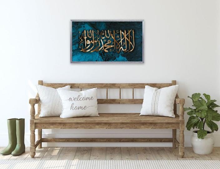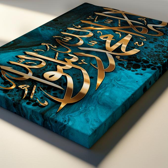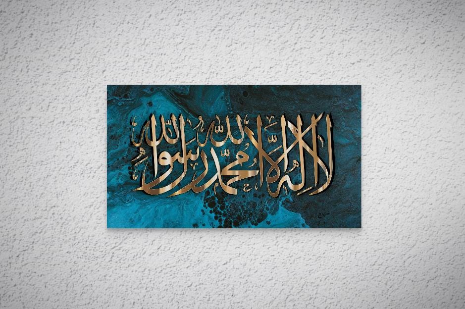 Bring elegance and spirituality into your home with this stunning piece of Islamic calligraphy art, featuring the Shahada (Declaration of Faith) beautifully written in bold golden Arabic script. The calligraphy is set against a striking turquoise and black marble-effect background, blending modern abstract art with timeless tradition.