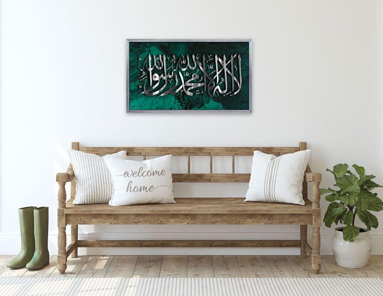 Elevate your home or prayer space with this bold and modern artwork featuring the Shahada (Islamic declaration of faith) in sleek silver Arabic calligraphy. Set against a mesmerizing emerald green and black marble-effect background, this canvas perfectly blends spiritual depth with contemporary design.