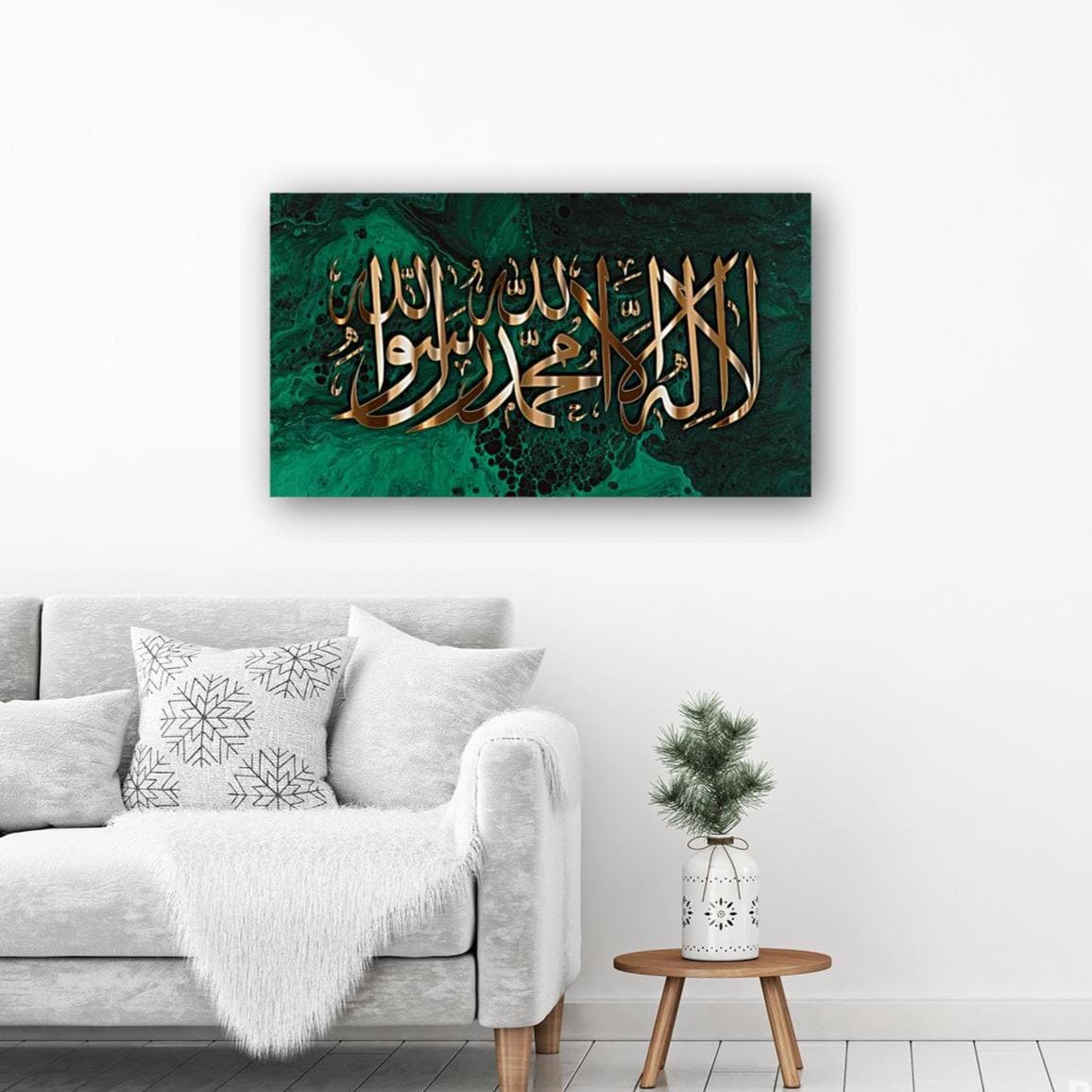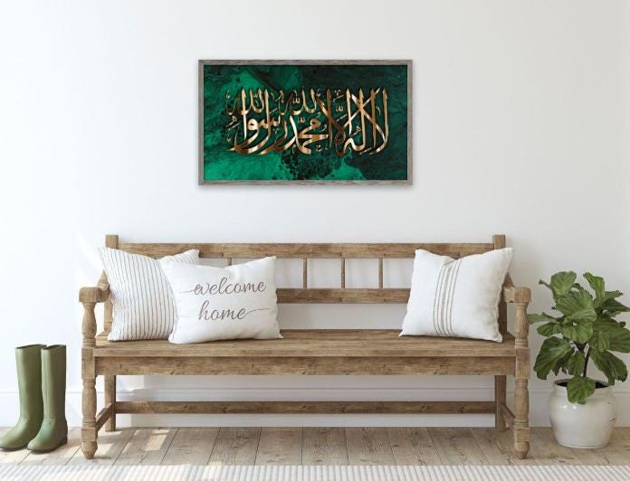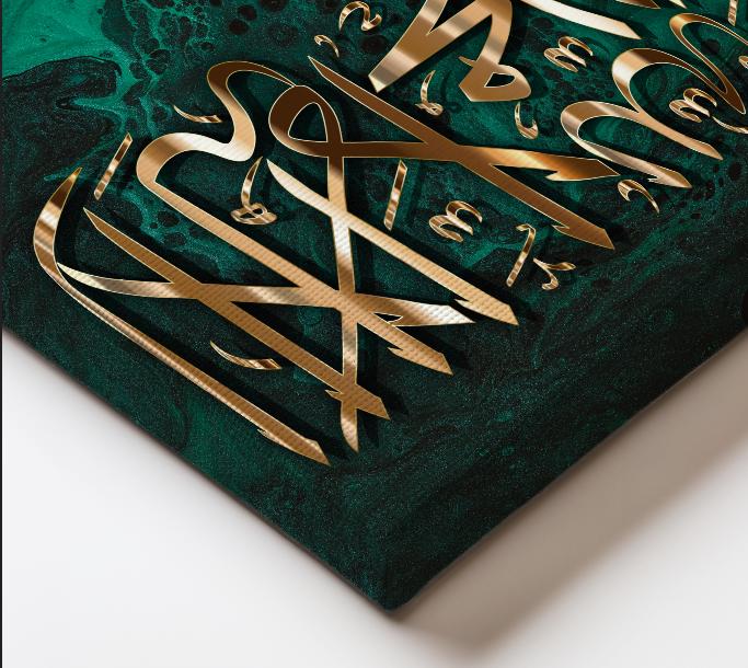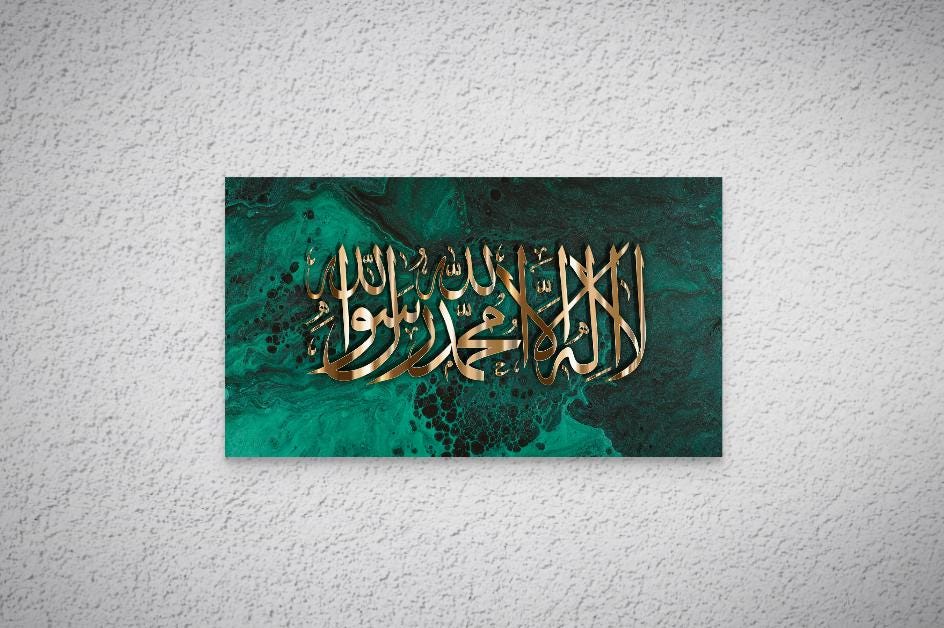 Bring elegance and spirituality into your home with this stunning piece of Islamic calligraphy art, featuring the Shahada (Declaration of Faith) beautifully written in bold golden Arabic script. The calligraphy is set against a striking emerald green and black marble-effect background, blending modern abstract art with timeless tradition.