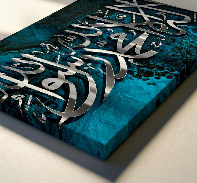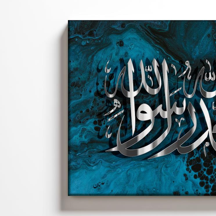 Bring elegance and spirituality into your home with this stunning piece of Islamic calligraphy art, featuring the Shahada (Declaration of Faith) beautifully written in bold silver Arabic script. The calligraphy is set against a striking turquoise and black marble-effect background, blending modern abstract art with timeless tradition.