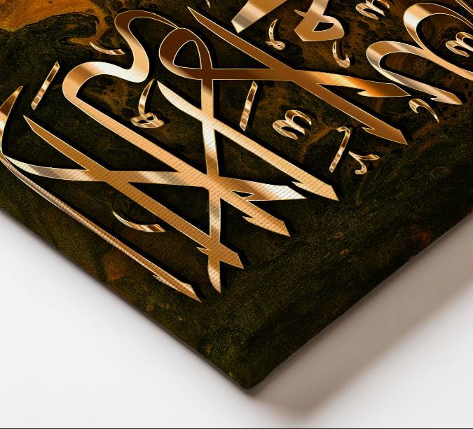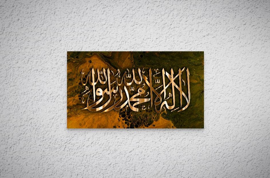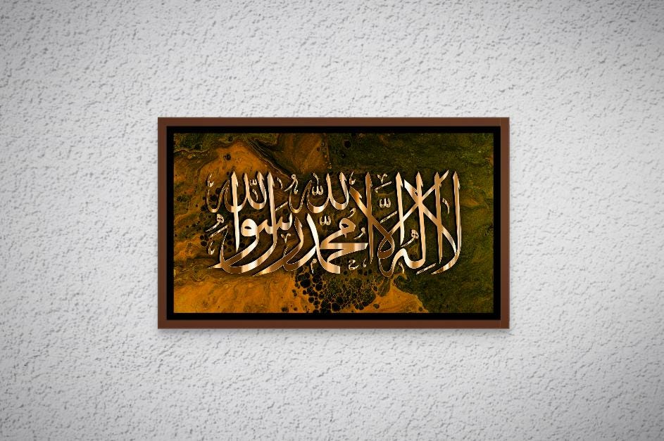 Bring elegance and spirituality into your home with this stunning piece of Islamic calligraphy art, featuring the Shahada (Declaration of Faith) beautifully written in bold golden Arabic script. The calligraphy is set against a striking burnt brown and black marble-effect background, blending modern abstract art with timeless tradition.