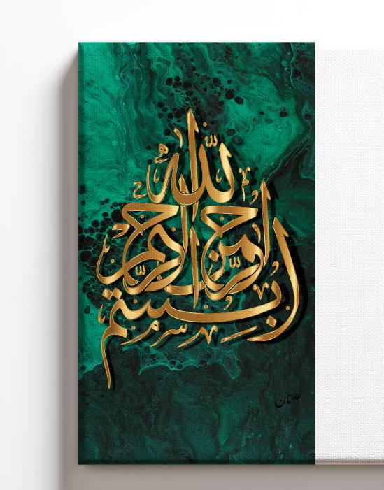 Bring elegance and spirituality into your home with this stunning piece of Islamic calligraphy art, featuring Bismilla beautifully written in bold gold Arabic script. The calligraphy is set against a striking emerald green and black marble-effect background, blending modern abstract art with timeless tradition.