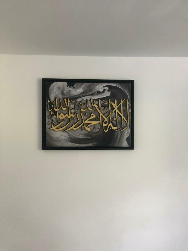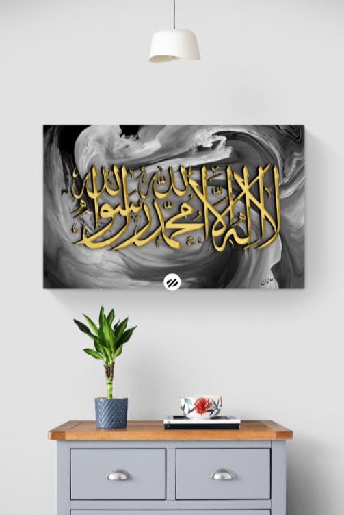 Bring elegance and spirituality into your home with this stunning piece of Islamic calligraphy art, featuring the Shahada (Declaration of Faith) beautifully written in bold golden Arabic script. The calligraphy is set against a striking marble grey and black marble-effect background, blending modern abstract art with timeless tradition.