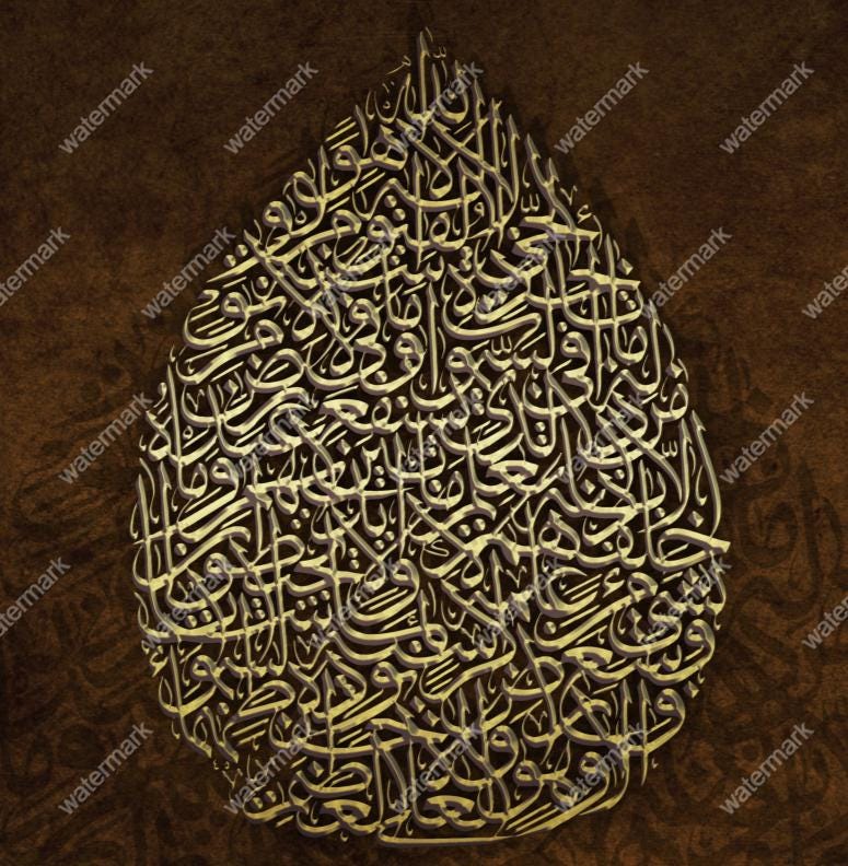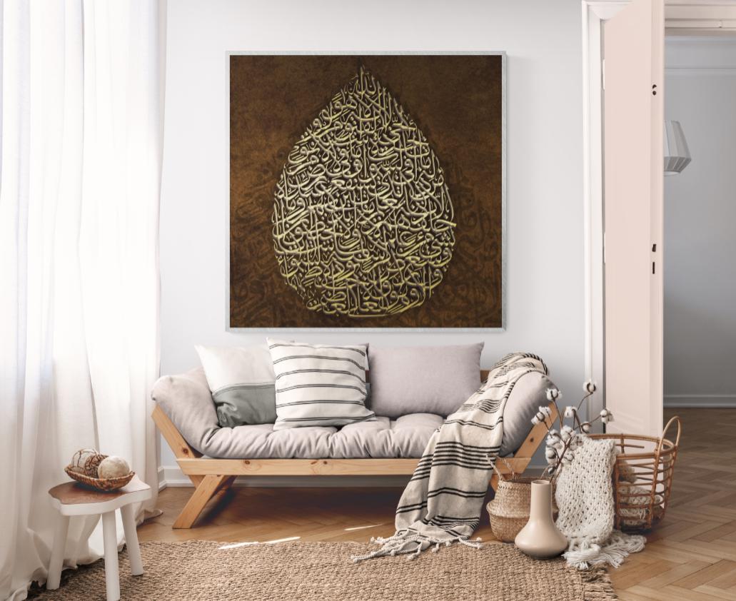 Elevate your space with spiritual elegance through this luxurious Islamic wall art, featuring the powerful Ayatul Kursi verse in rich gold Arabic calligraphy. Set in a striking teardrop composition, the sacred script rests on a warm textured brown canvas, evoking tradition, depth, and tranquility.