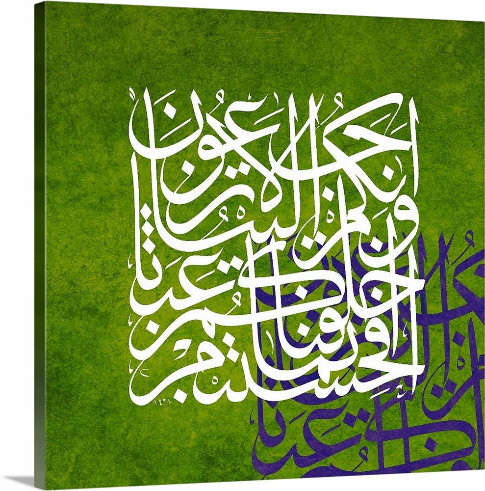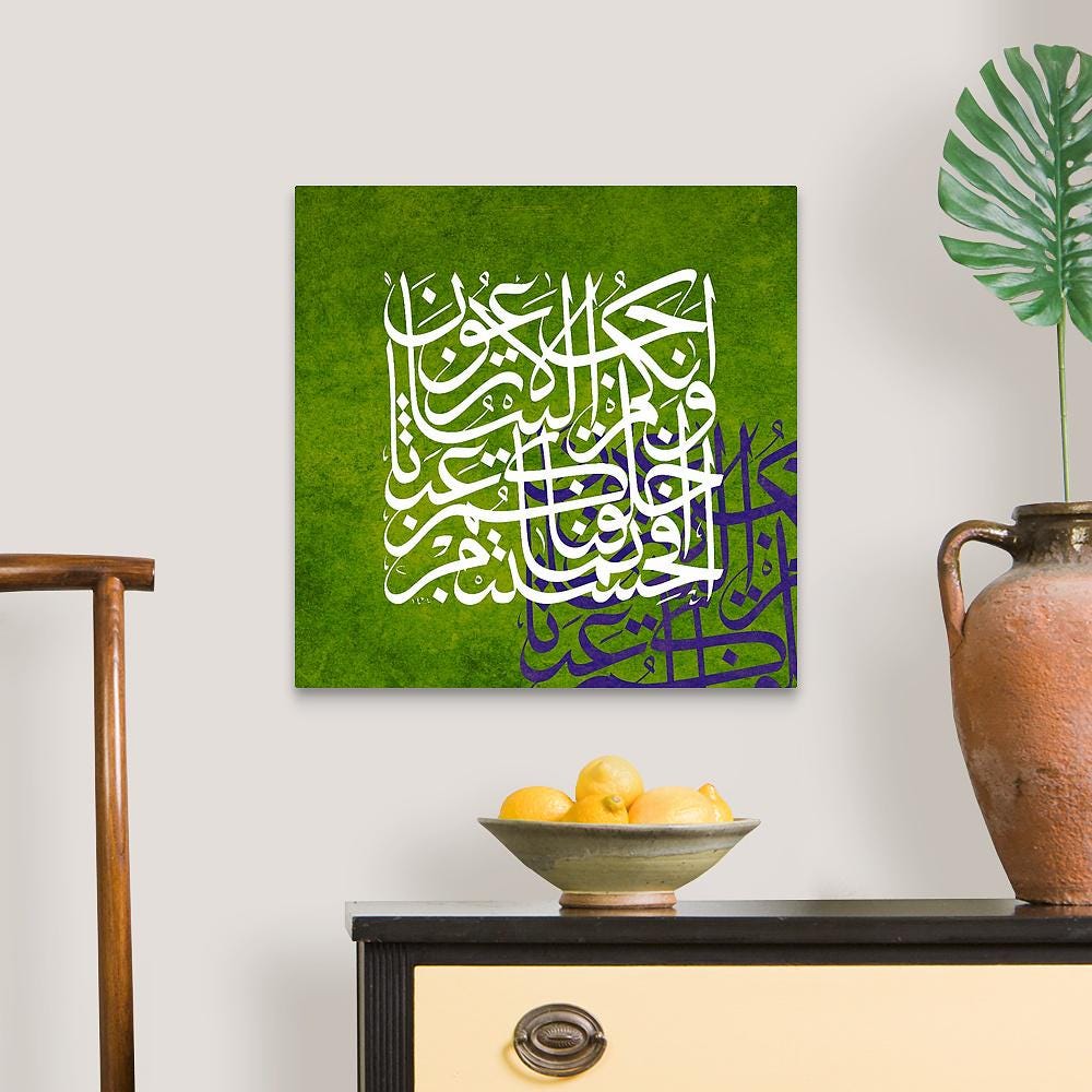 Handcrafted in elegant, modern Kufic/Thuluth calligraphy, this canvas is available in a variety of background colors including emerald green, deep red, navy blue, earthy brown, turquoise, and more — each one carefully designed to complement your home’s aesthetic.