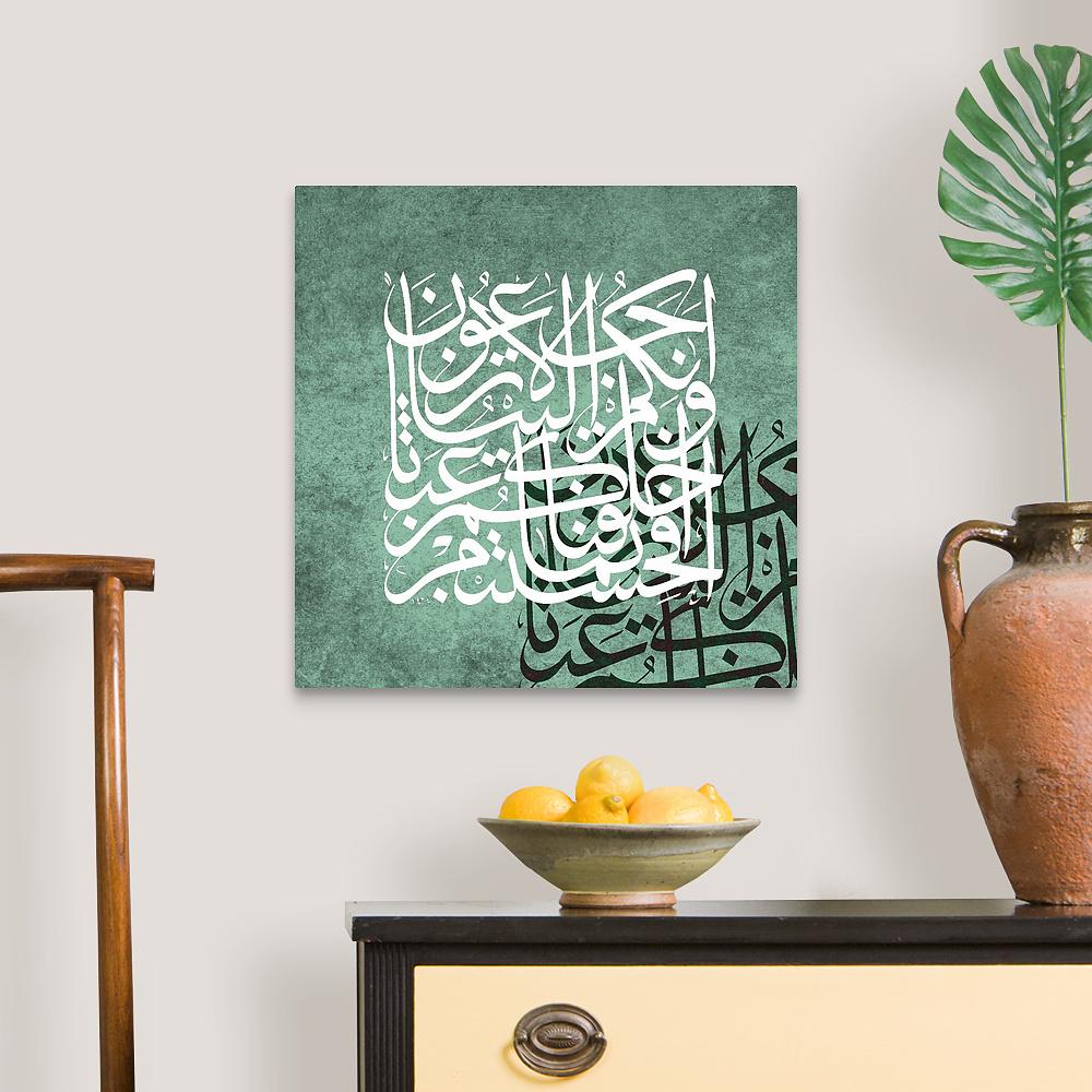 Handcrafted in elegant, modern Kufic/Thuluth calligraphy, this canvas is available in a variety of background colors including emerald green, deep red, navy blue, earthy brown, turquoise, and more — each one carefully designed to complement your home’s aesthetic.