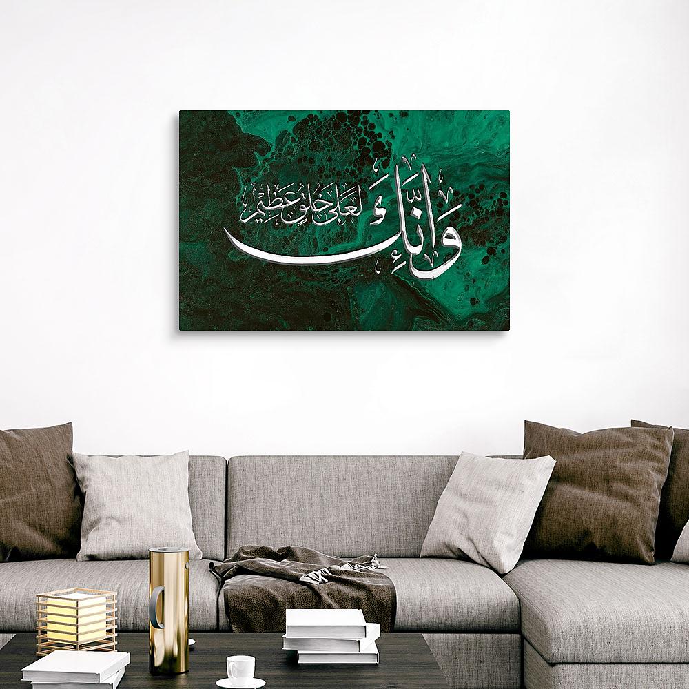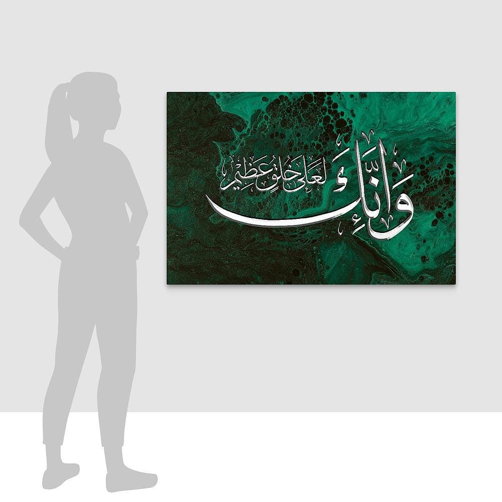 Elegant, minimalist, and spiritually profound – this Islamic artwork showcases Surah Al-Qalam (68:4) in sleek silver Arabic calligraphy against a jade green background. A timeless reminder of the Prophet’s ﷺ noble character, this canvas suits any contemporary or traditional Muslim home. Ideal as a gift or spiritual centerpiece in your prayer space.