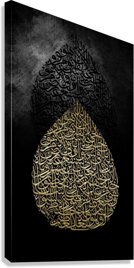 Add spiritual depth and timeless elegance to your home with this stunning Islamic wall art featuring Ayatul Kursi in intricate gold Arabic calligraphy, shaped into a beautiful teardrop design. Set against a rich coal background, this piece creates a warm and sophisticated ambiance — ideal for living rooms, prayer spaces, or as a meaningful gift.