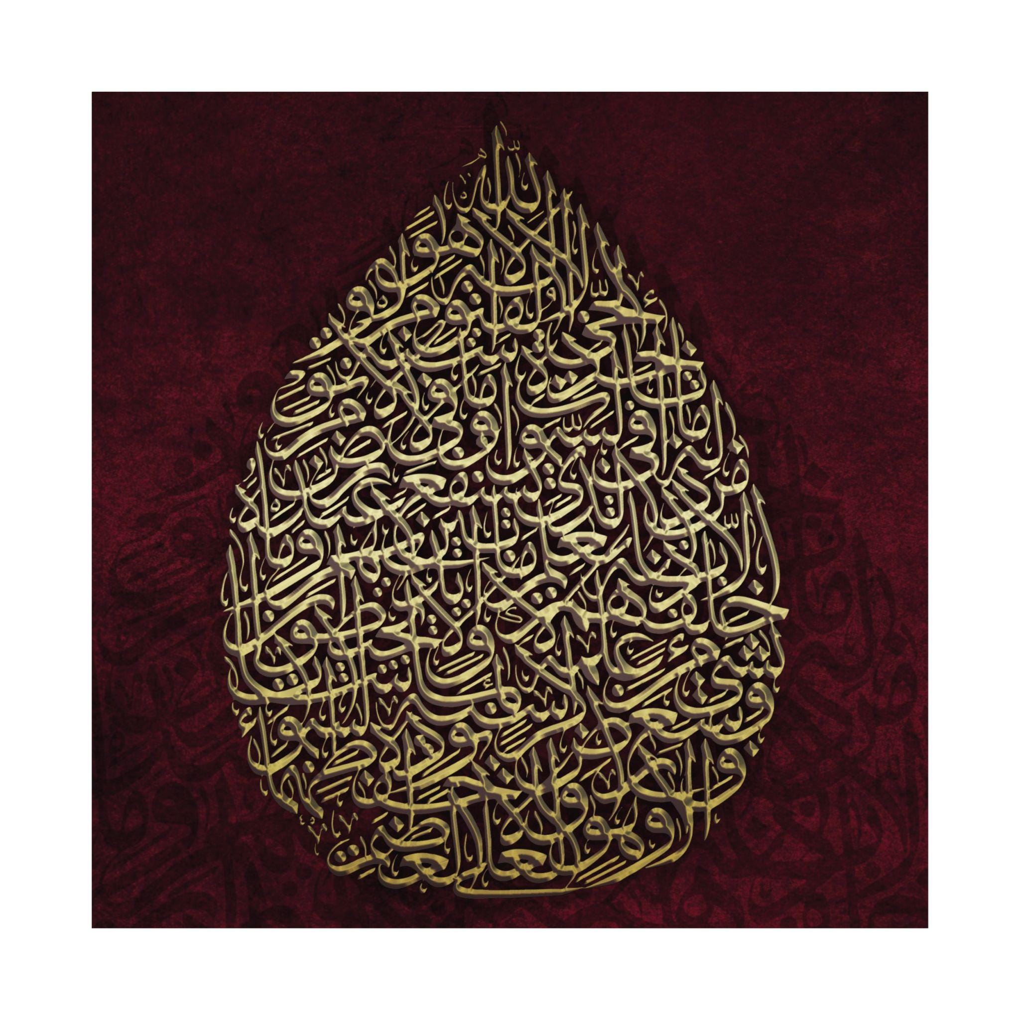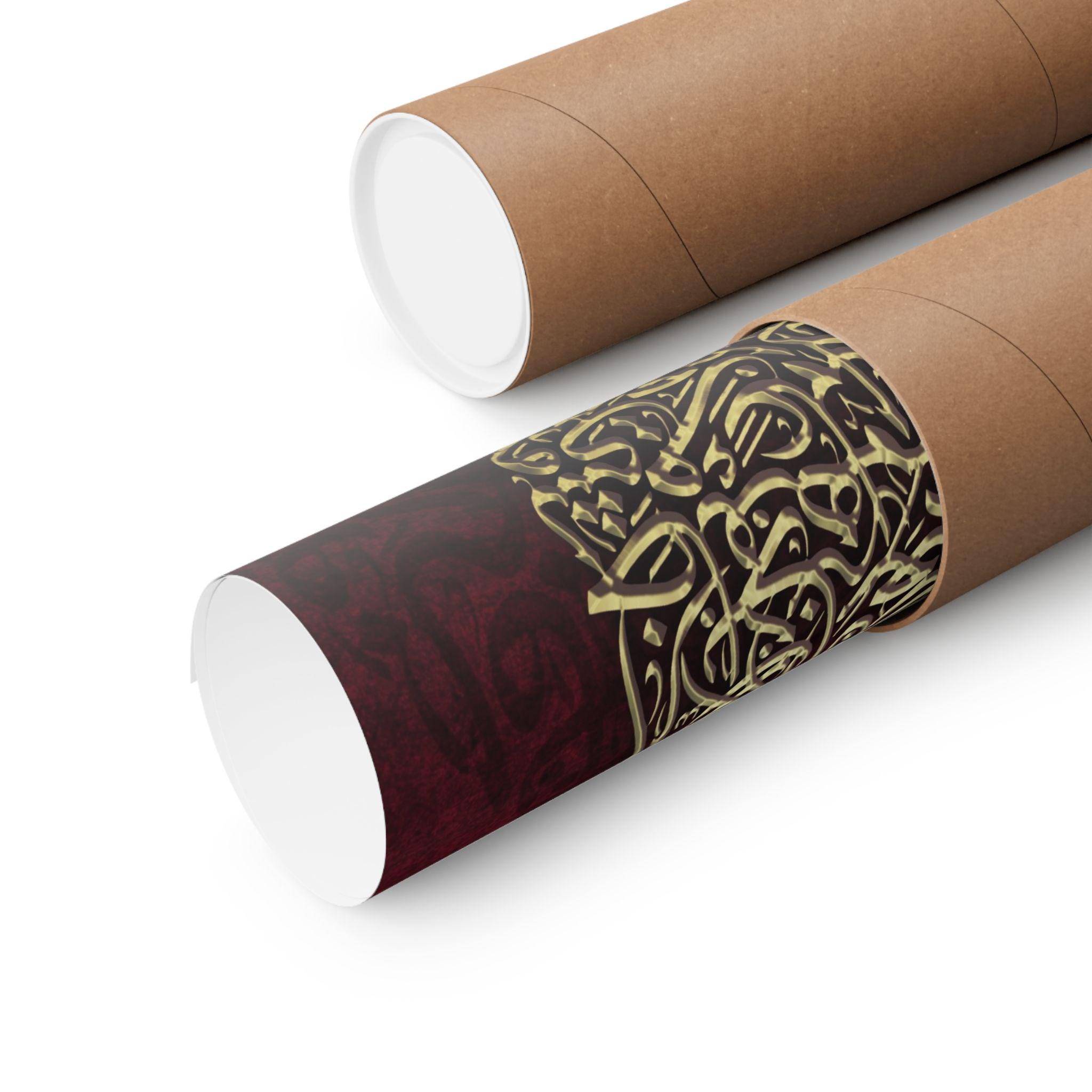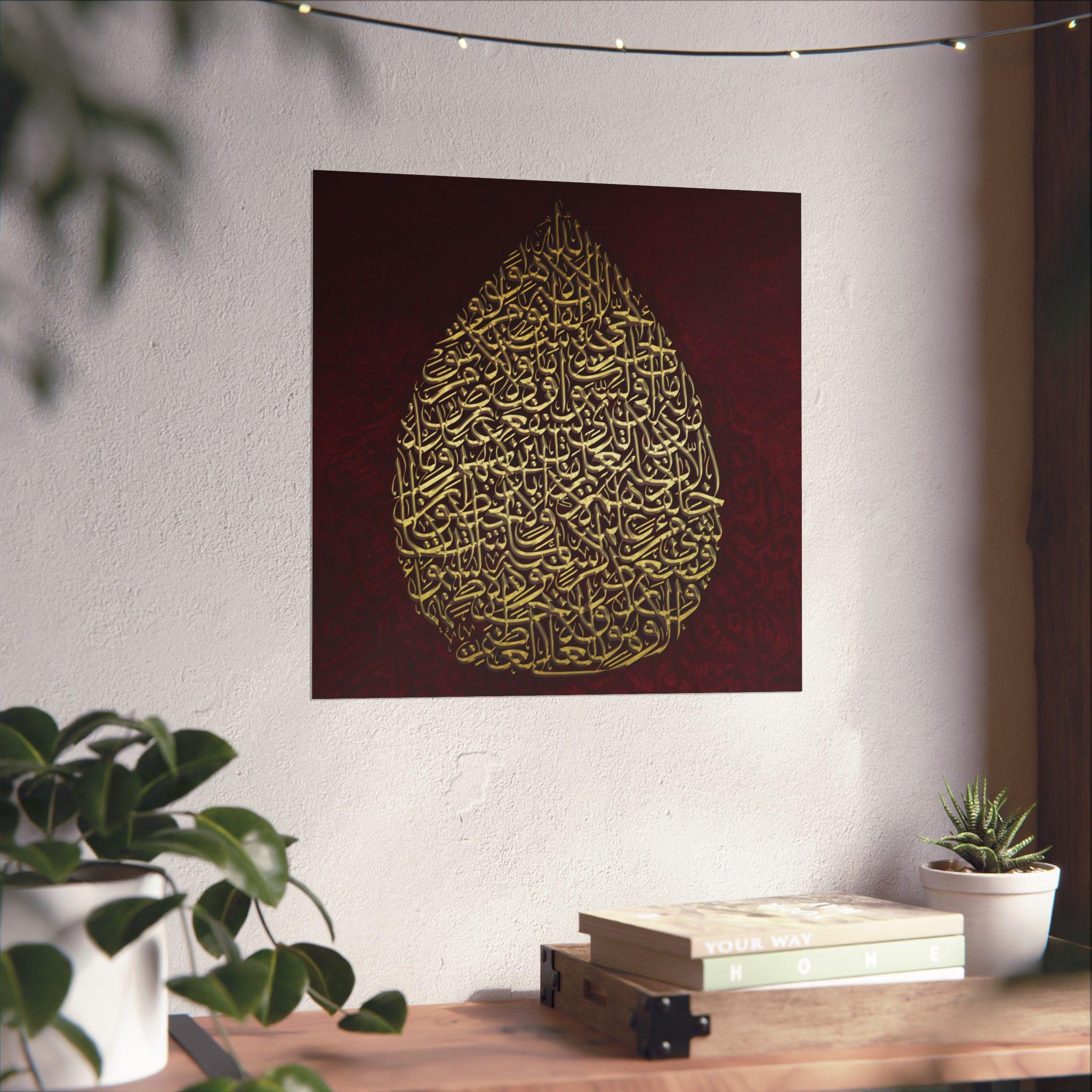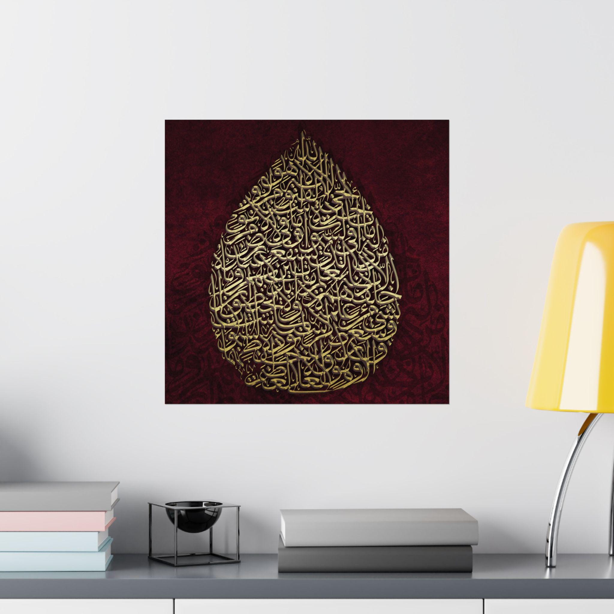 A matte horizontal poster that brings a quiet, contemplative presence to any wall. Deep maroon tones form a textured backdrop for an intricate golden teardrop of calligraphic script. The giclée printing delivers rich, lightfast color and fine detail, while the museum-grade archival paper and matte finish give the piece a sophisticated, non-reflective surface that reads like original art. Sizes across 46 options let you place it as a focal point above a sofa or tuck it into a gallery cluster for an intimate corner of reflection. Intended for indoor display, this poster ages gracefully and holds its color over time.
