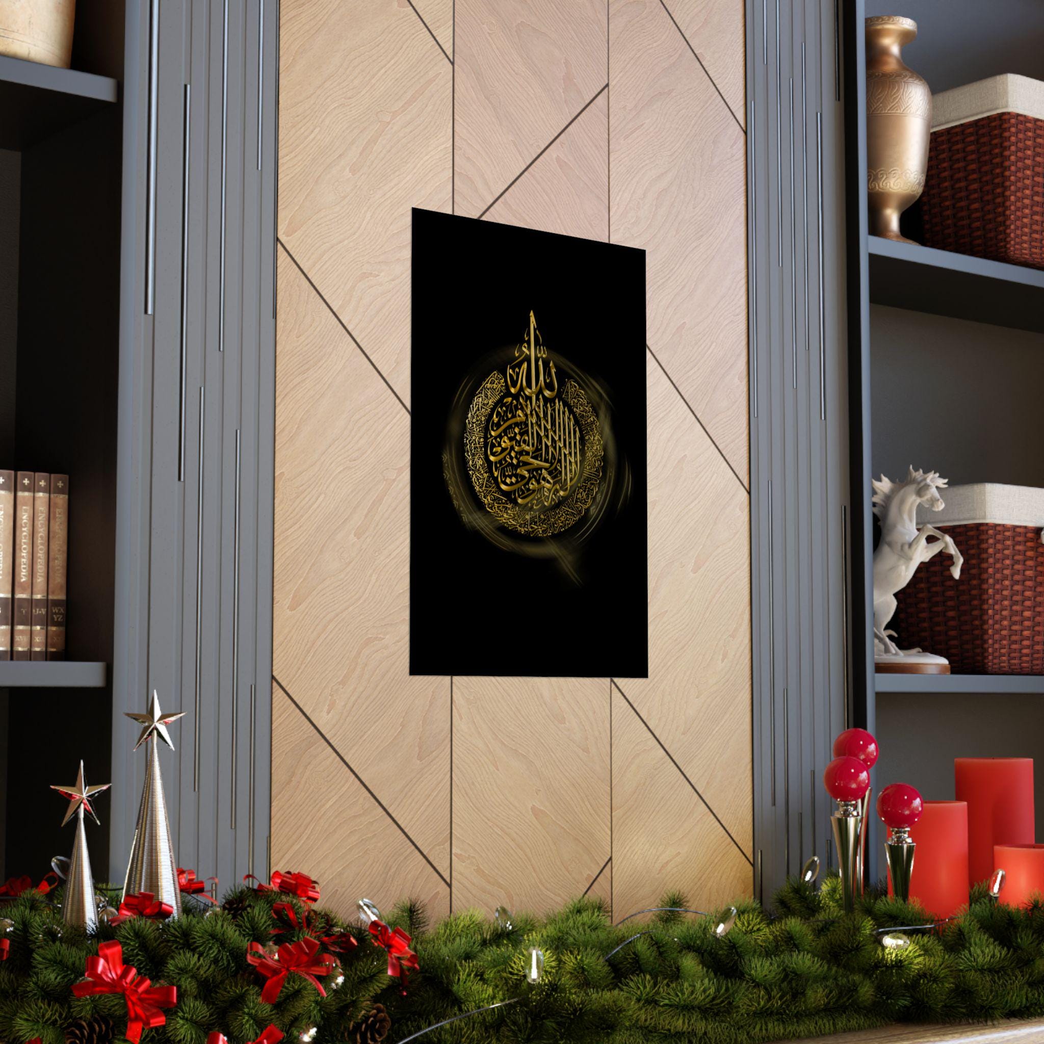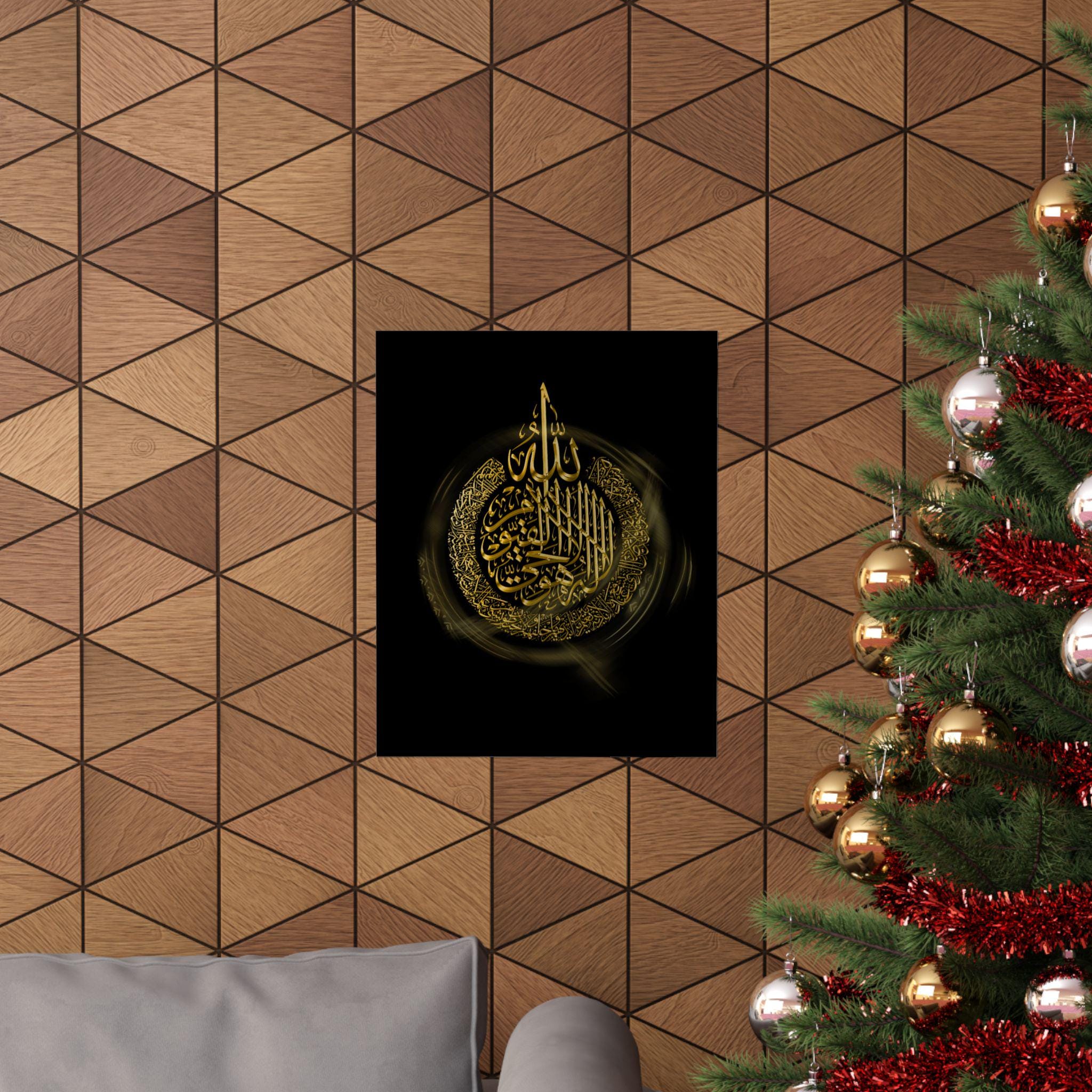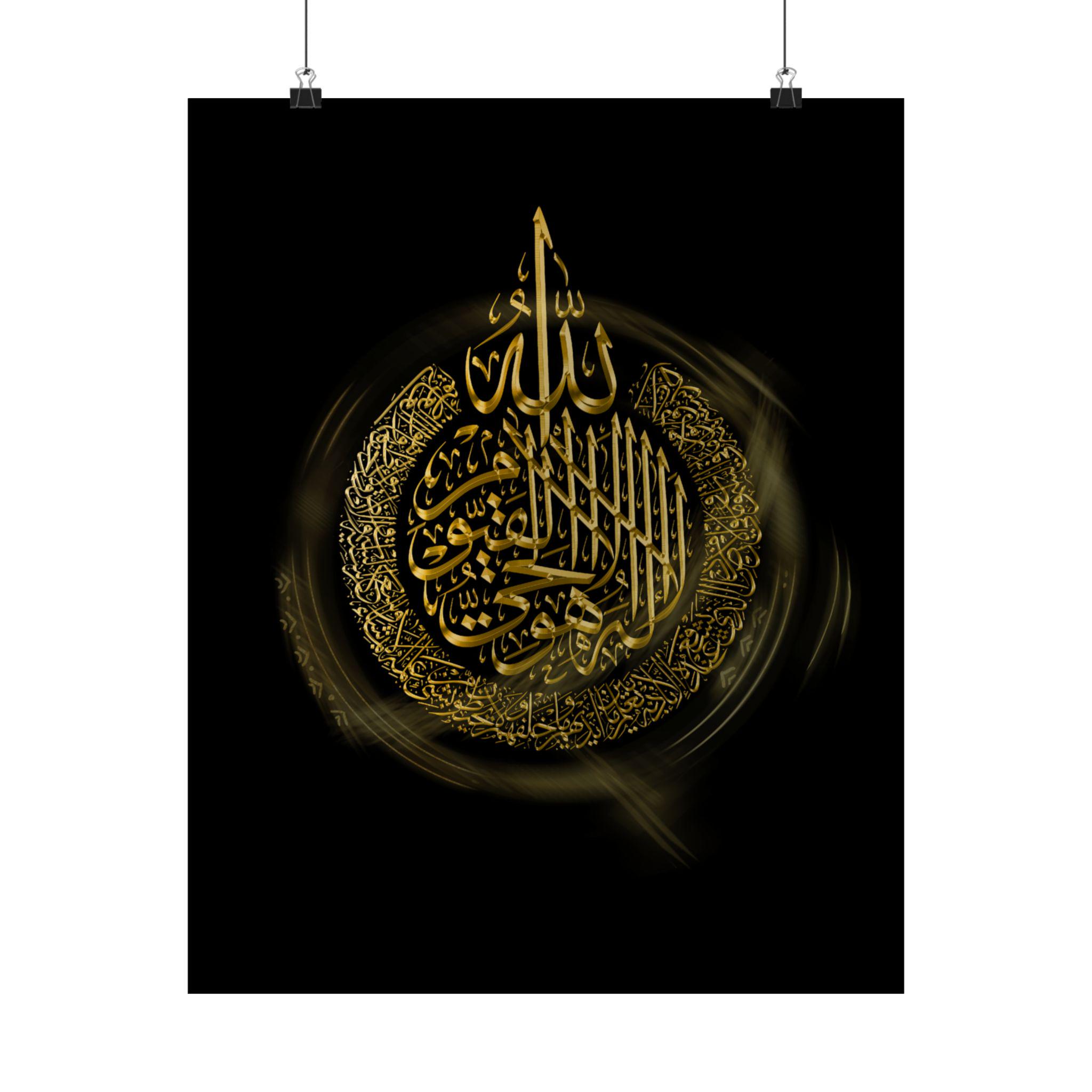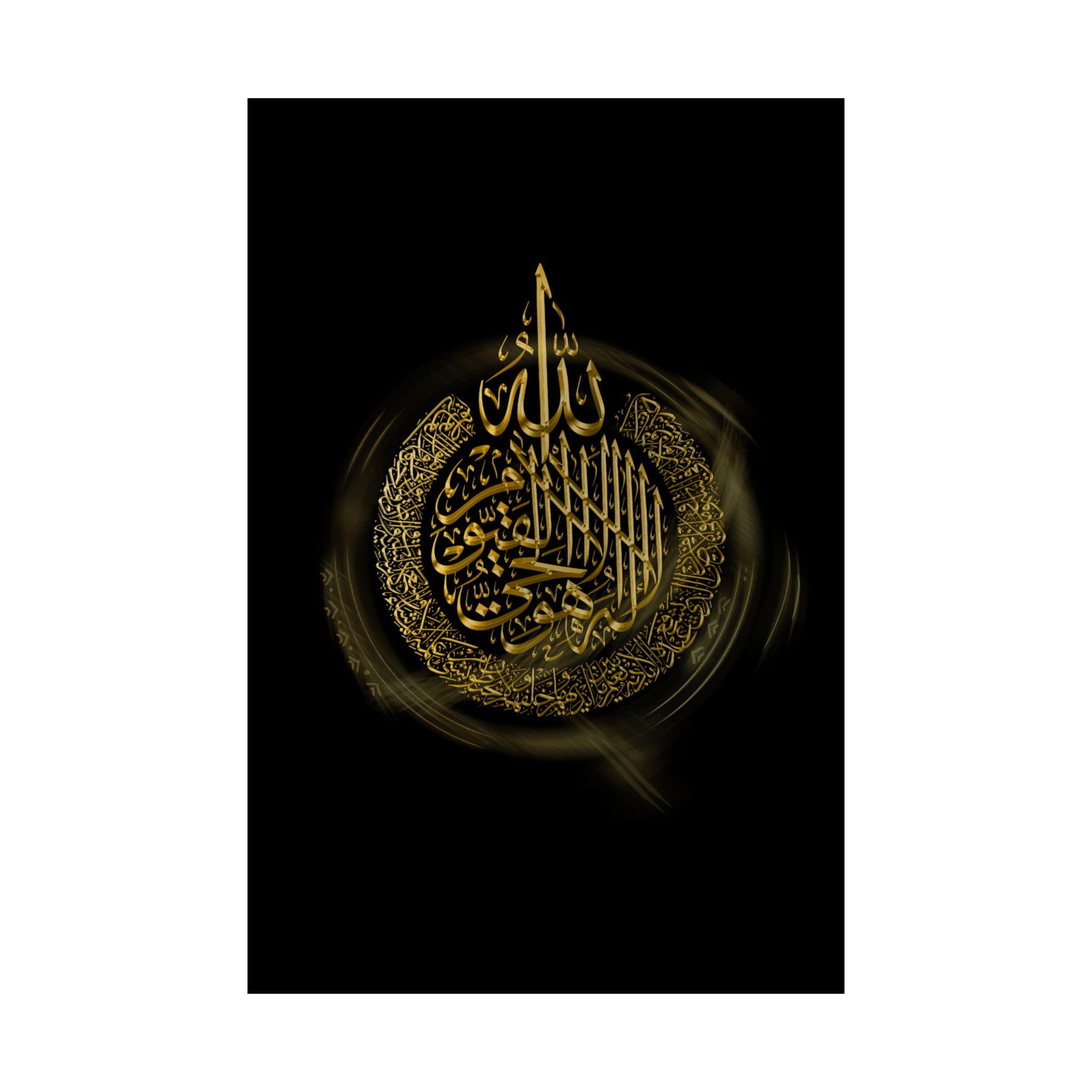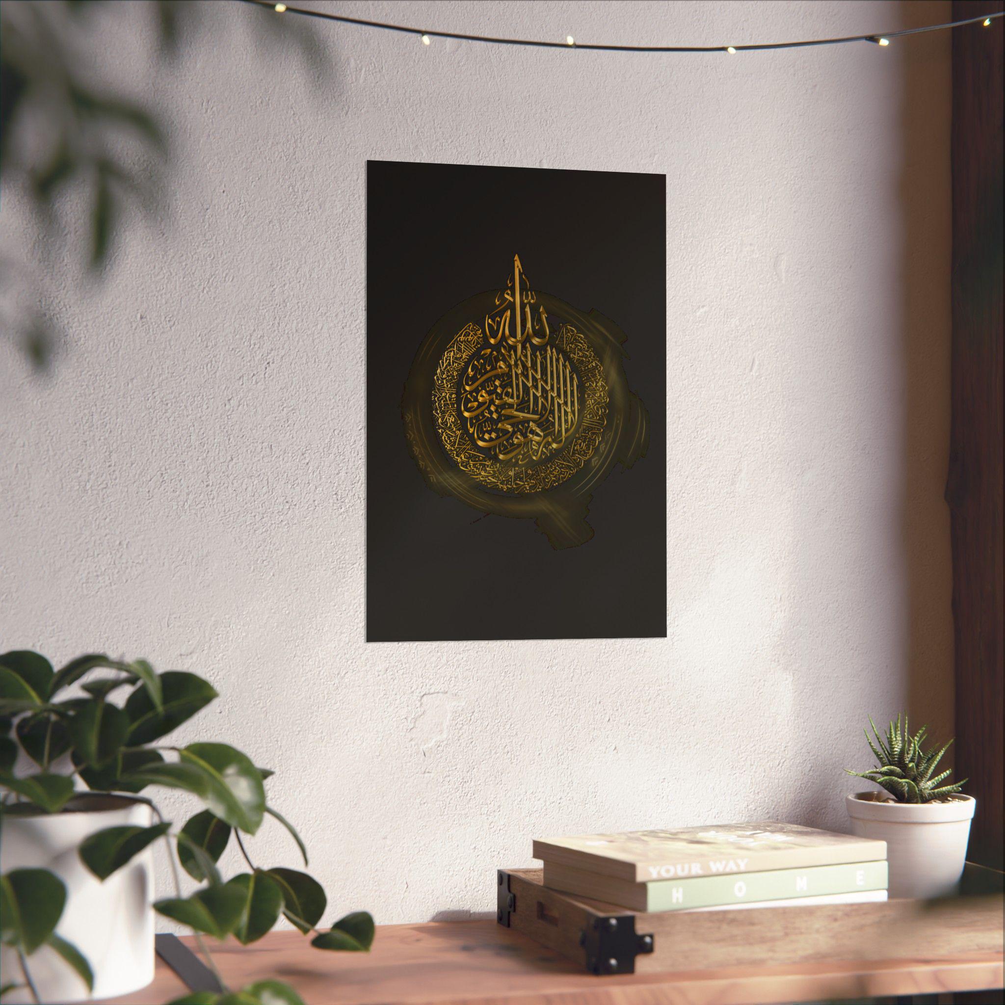 This matte vertical poster brings a calm, reverent atmosphere to any indoor space. Printed in rich giclée tones on museum-grade archival paper, the deep blacks and luminous gold calligraphy hold their clarity over time. The matte finish reduces glare while preserving the vivid, warm golds so the design reads beautifully from across a room. Sized to fit many frames (46 size options) and produced with strict archival standards, it settles into a quiet corner of a home, prayer room, or study and invites stillness each time you pass it.