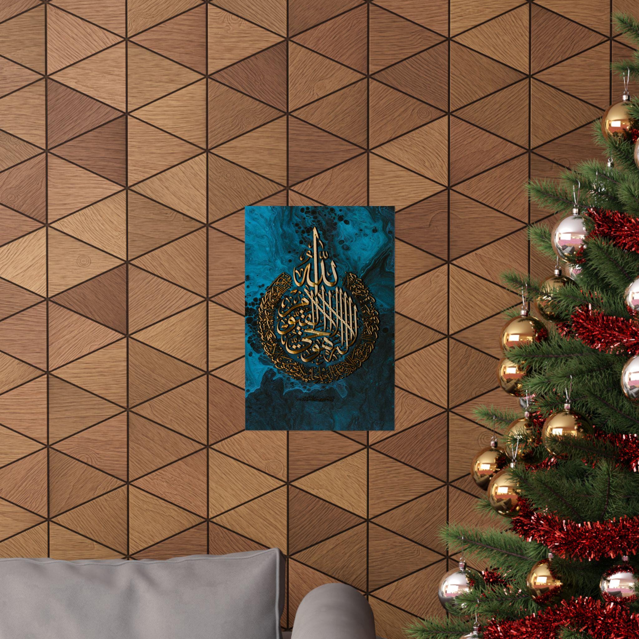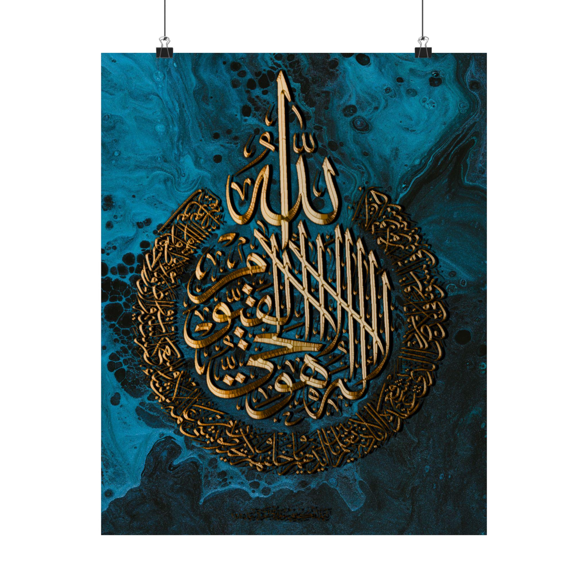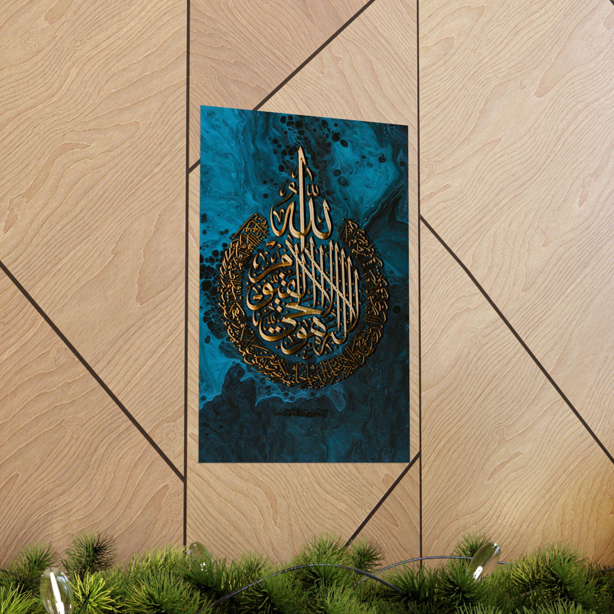 This matte vertical poster brings a calm, reverent atmosphere to any indoor space. Printed in rich giclée tones on museum-grade archival paper, the deep blue and luminous gold calligraphy hold their clarity over time. The matte finish reduces glare while preserving the vivid, warm golds so the design reads beautifully from across a room. Sized to fit many frames (46 size options) and produced with strict archival standards, it settles into a quiet corner of a home, prayer room, or study and invites stillness each time you pass it.