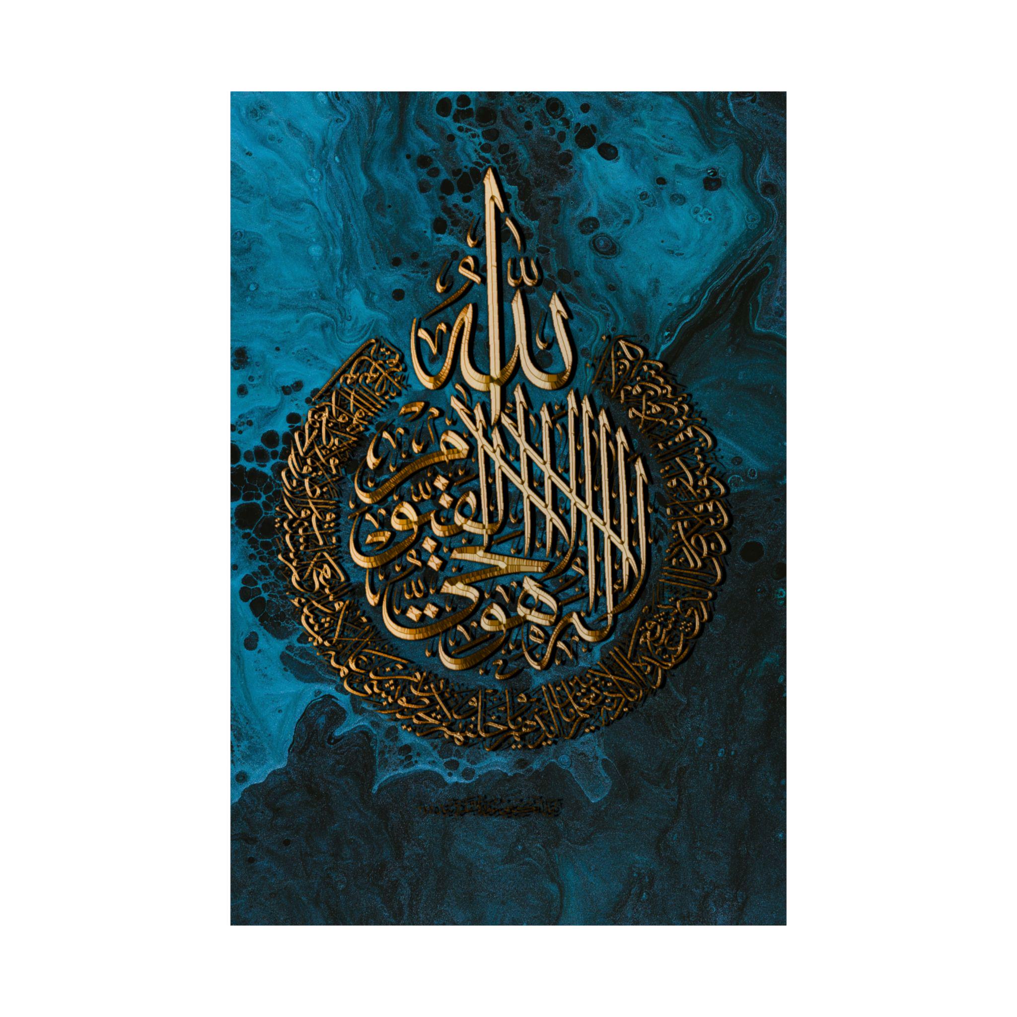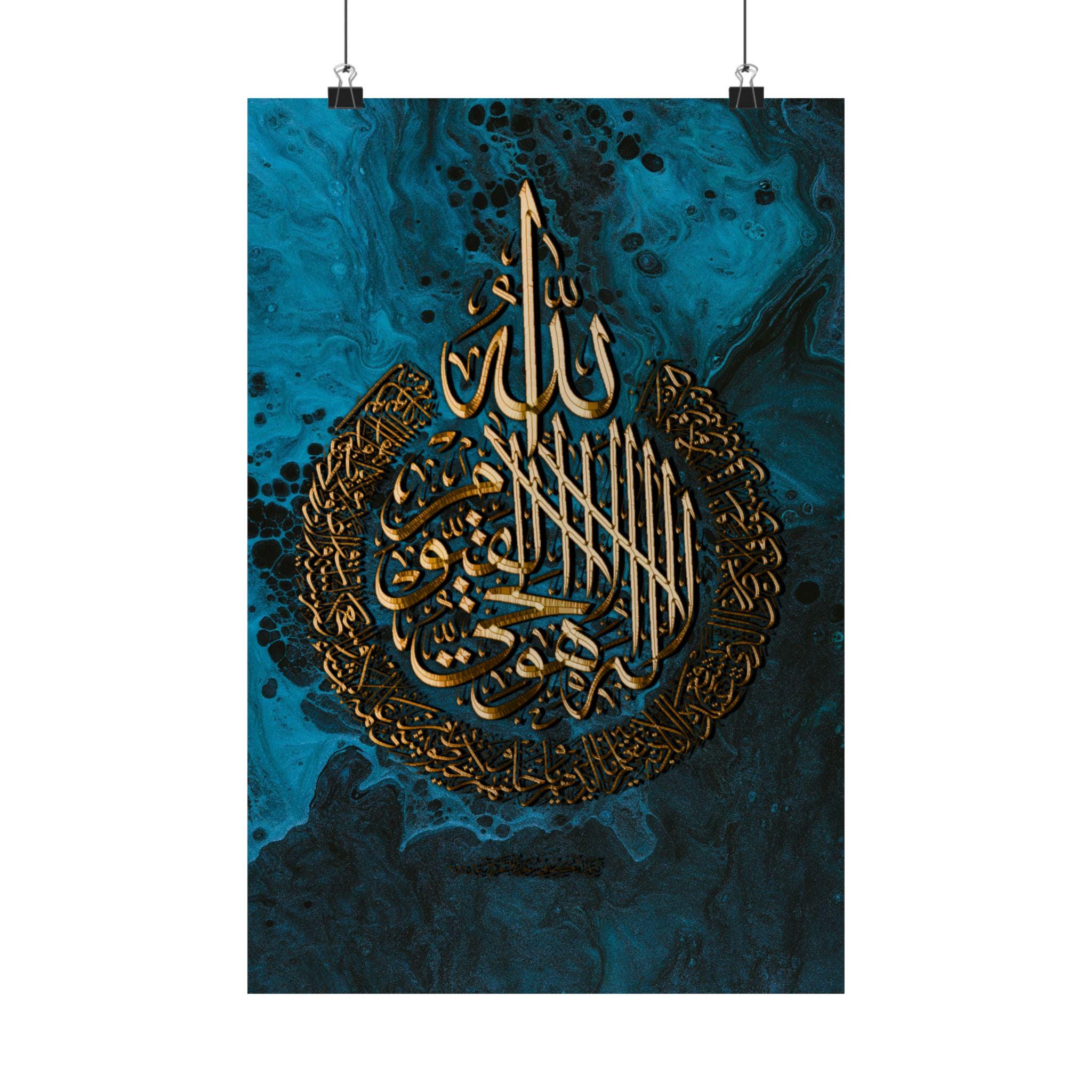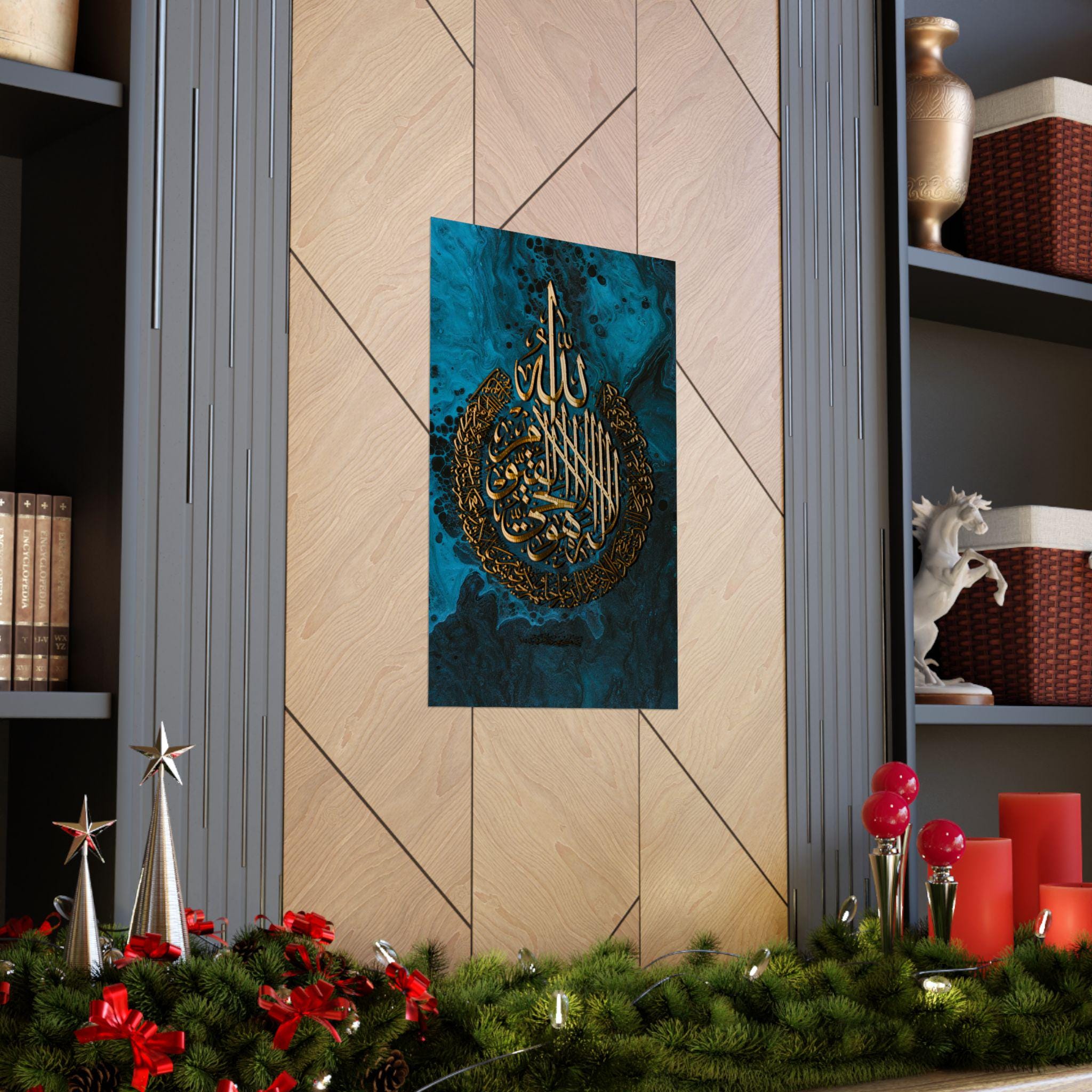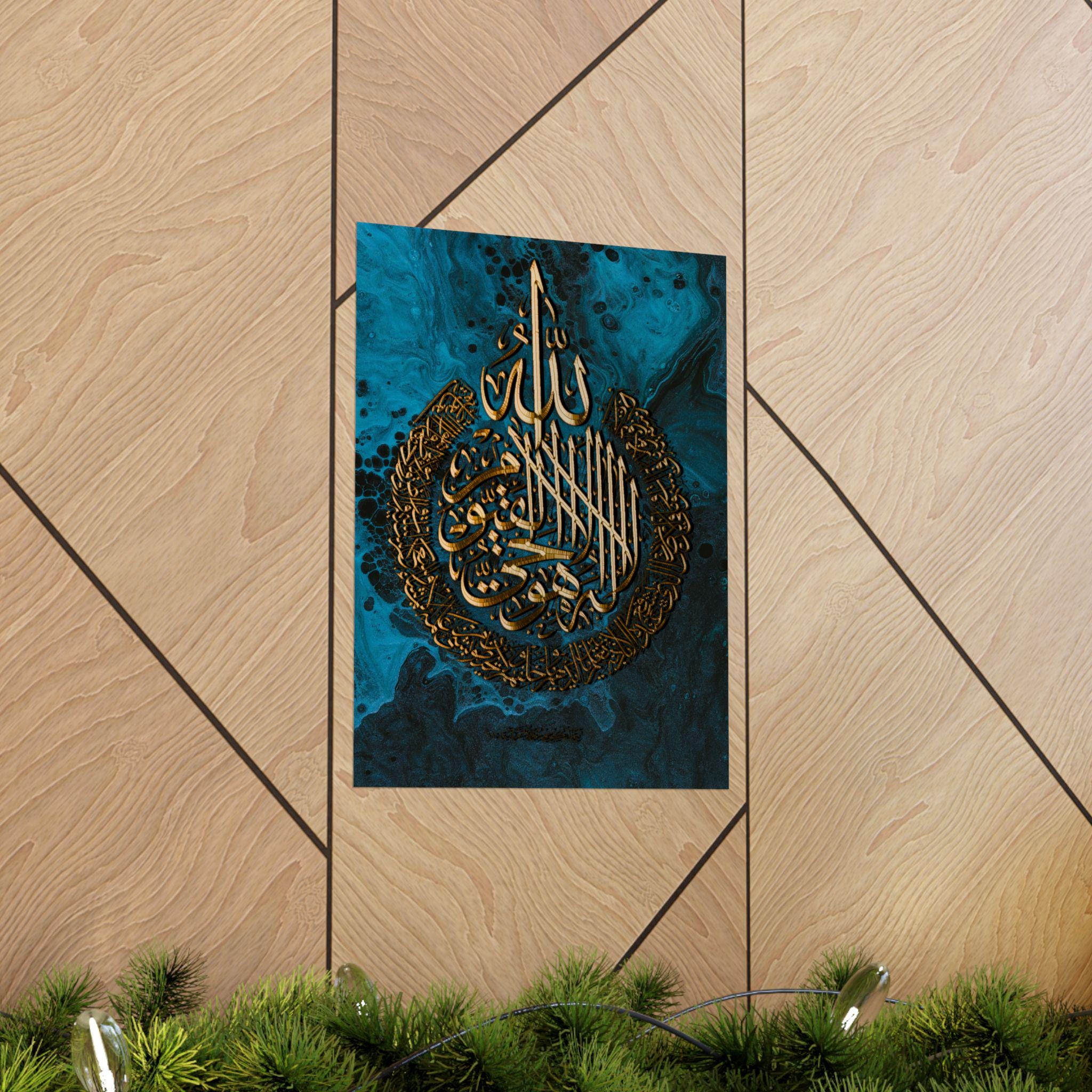 This matte vertical poster brings a calm, reverent atmosphere to any indoor space. Printed in rich giclée tones on museum-grade archival paper, the deep blue and luminous gold calligraphy hold their clarity over time. The matte finish reduces glare while preserving the vivid, warm golds so the design reads beautifully from across a room. Sized to fit many frames (46 size options) and produced with strict archival standards, it settles into a quiet corner of a home, prayer room, or study and invites stillness each time you pass it.