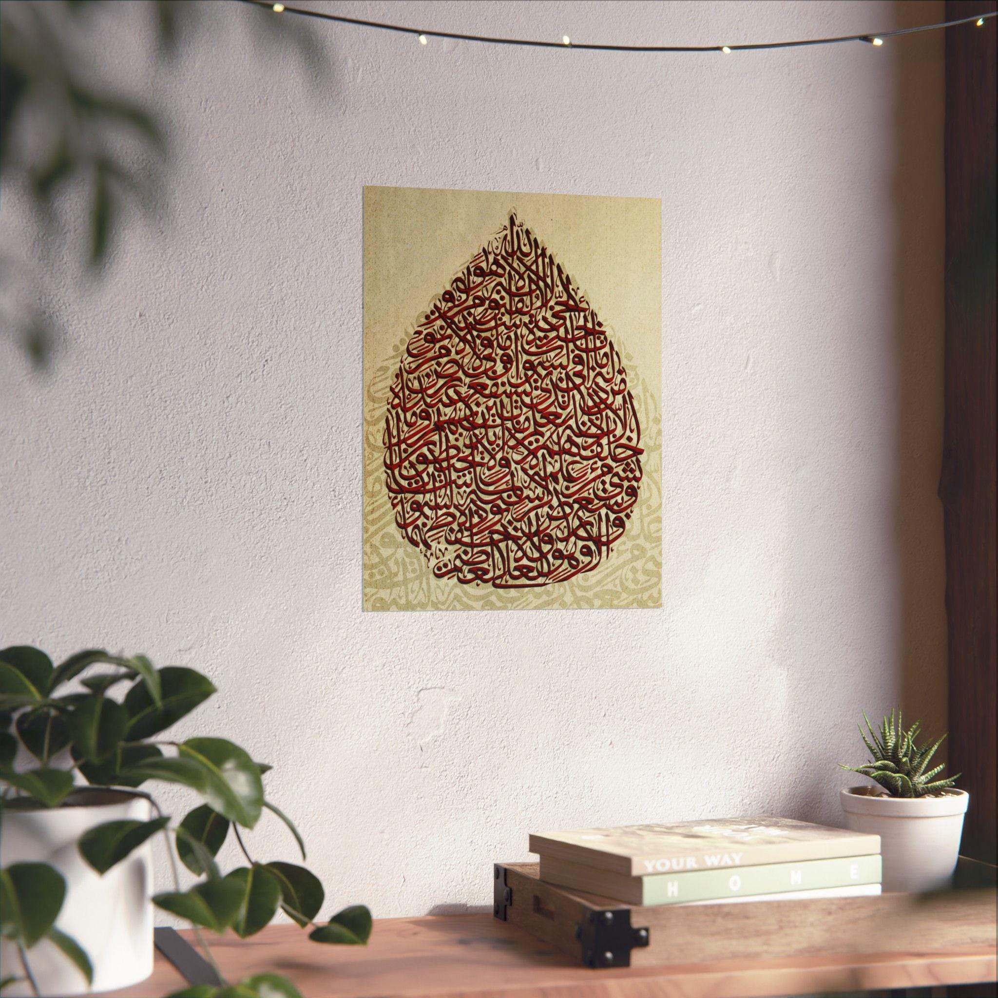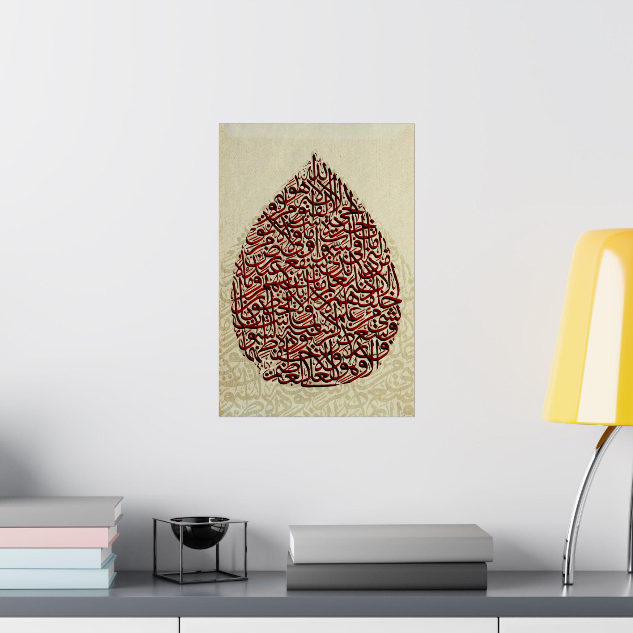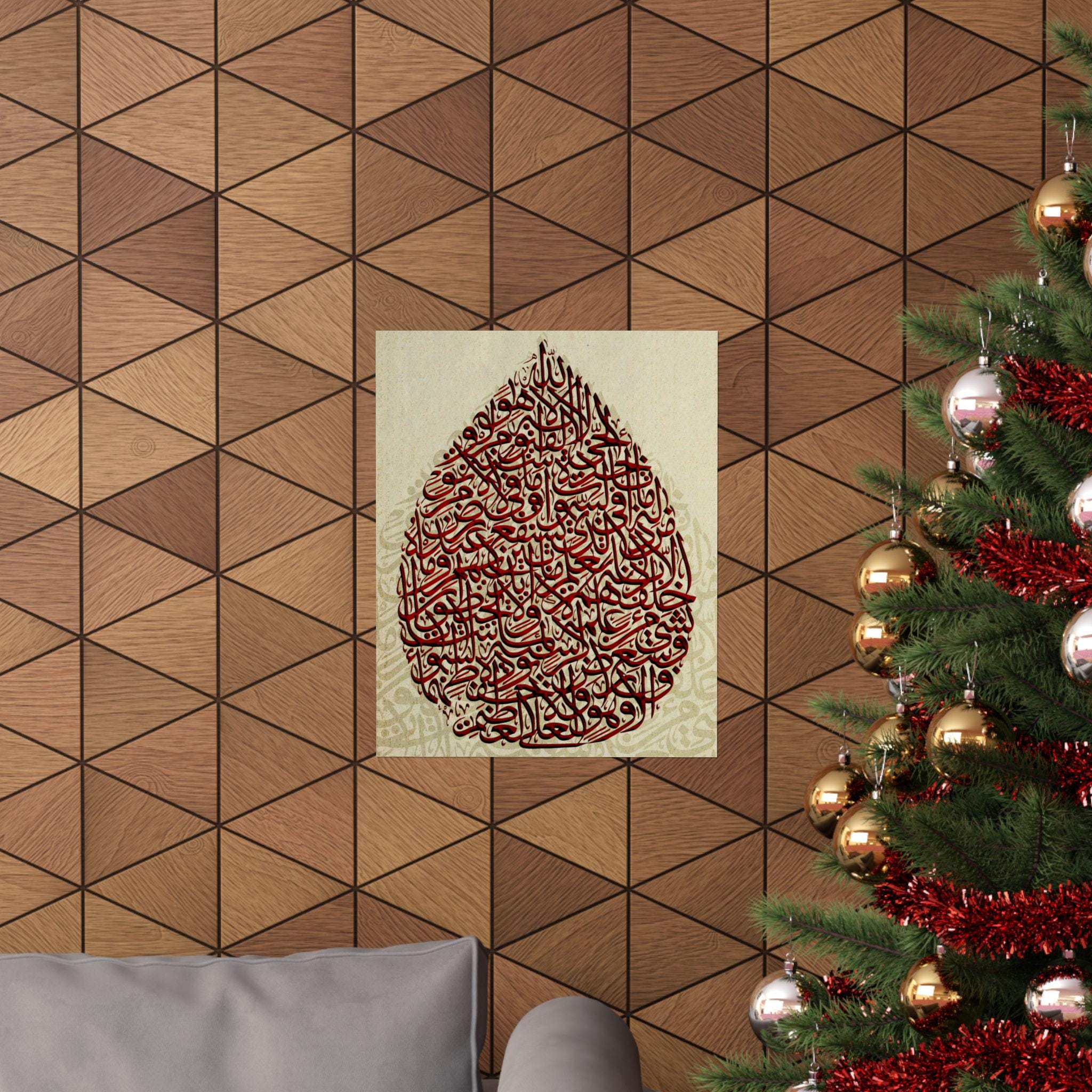 This matte vertical poster brings a calm, reverent atmosphere to any indoor space. Printed in rich giclée tones on museum-grade archival paper, the deep maroon and luminous gold calligraphy hold their clarity over time. The matte finish reduces glare while preserving the vivid, warm golds so the design reads beautifully from across a room. Sized to fit many frames (46 size options) and produced with strict archival standards, it settles into a quiet corner of a home, prayer room, or study and invites stillness each time you pass it.