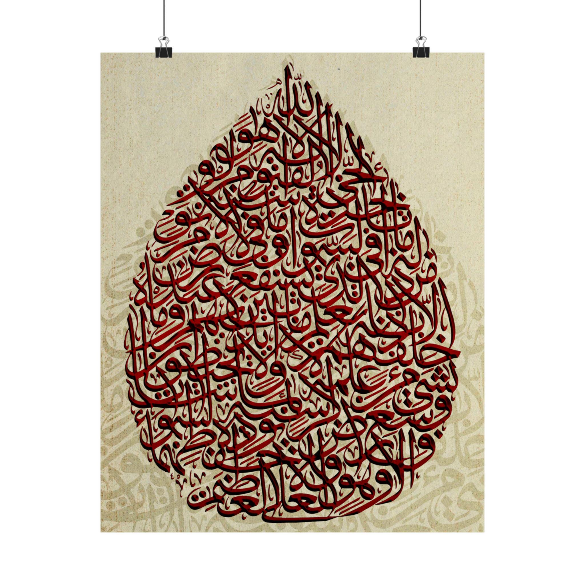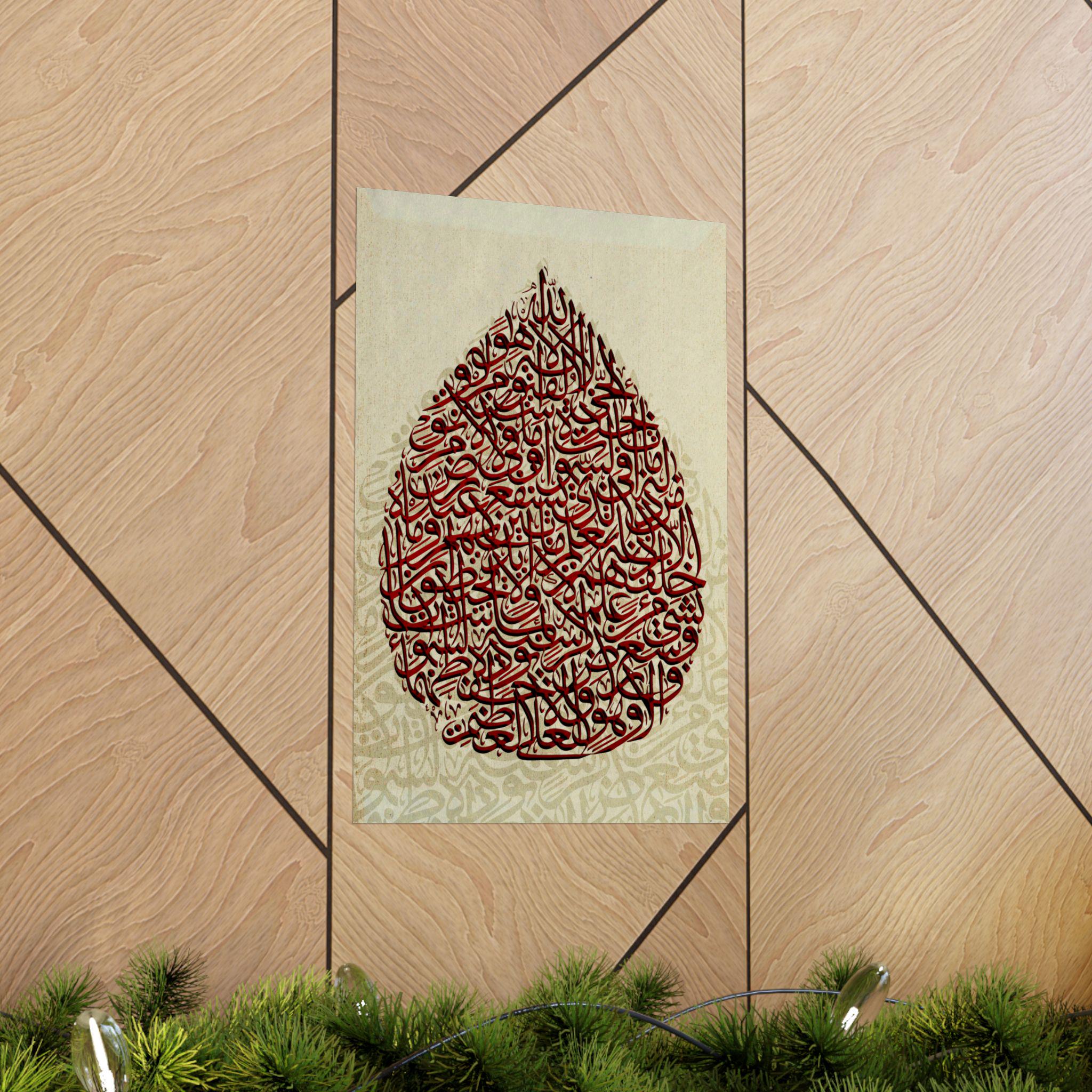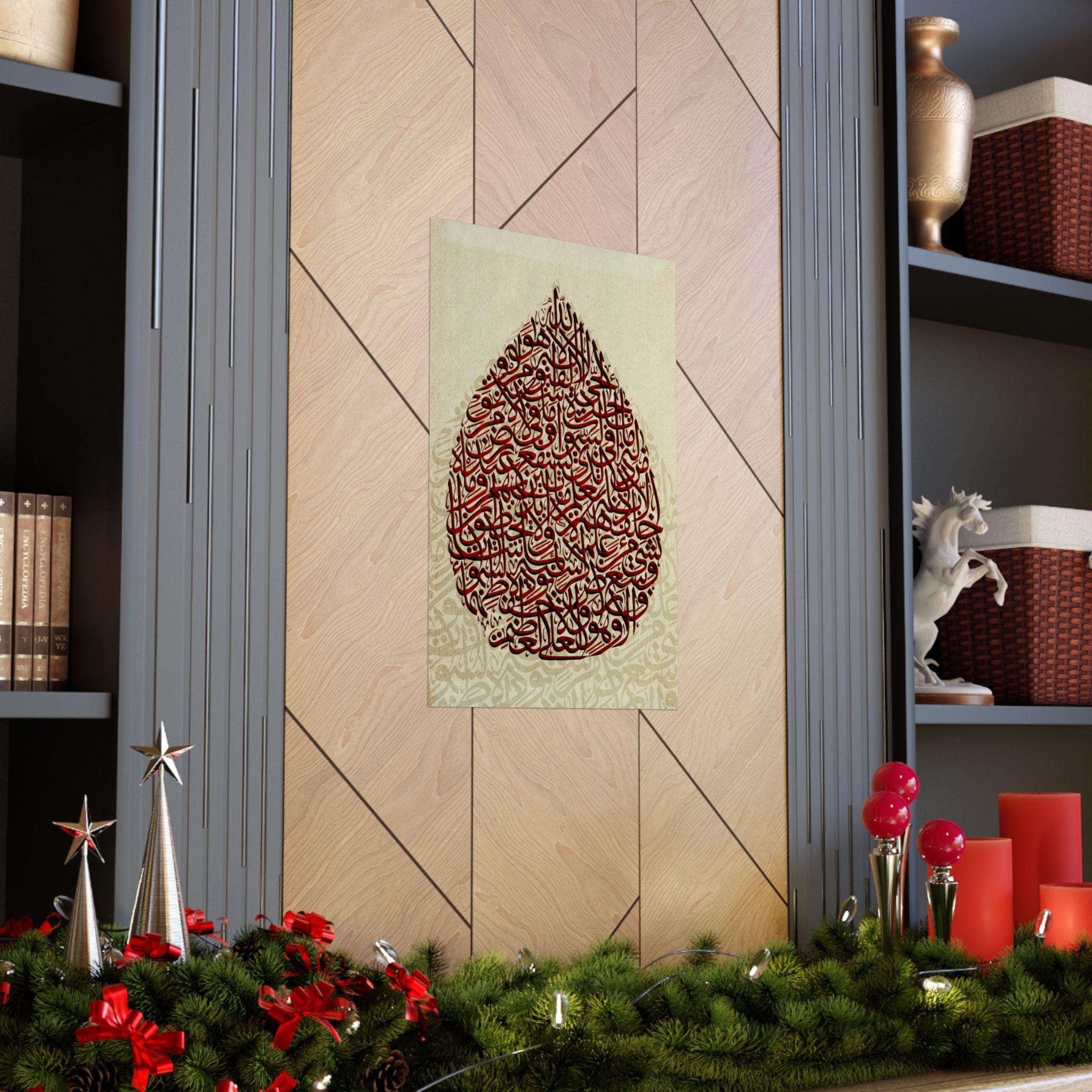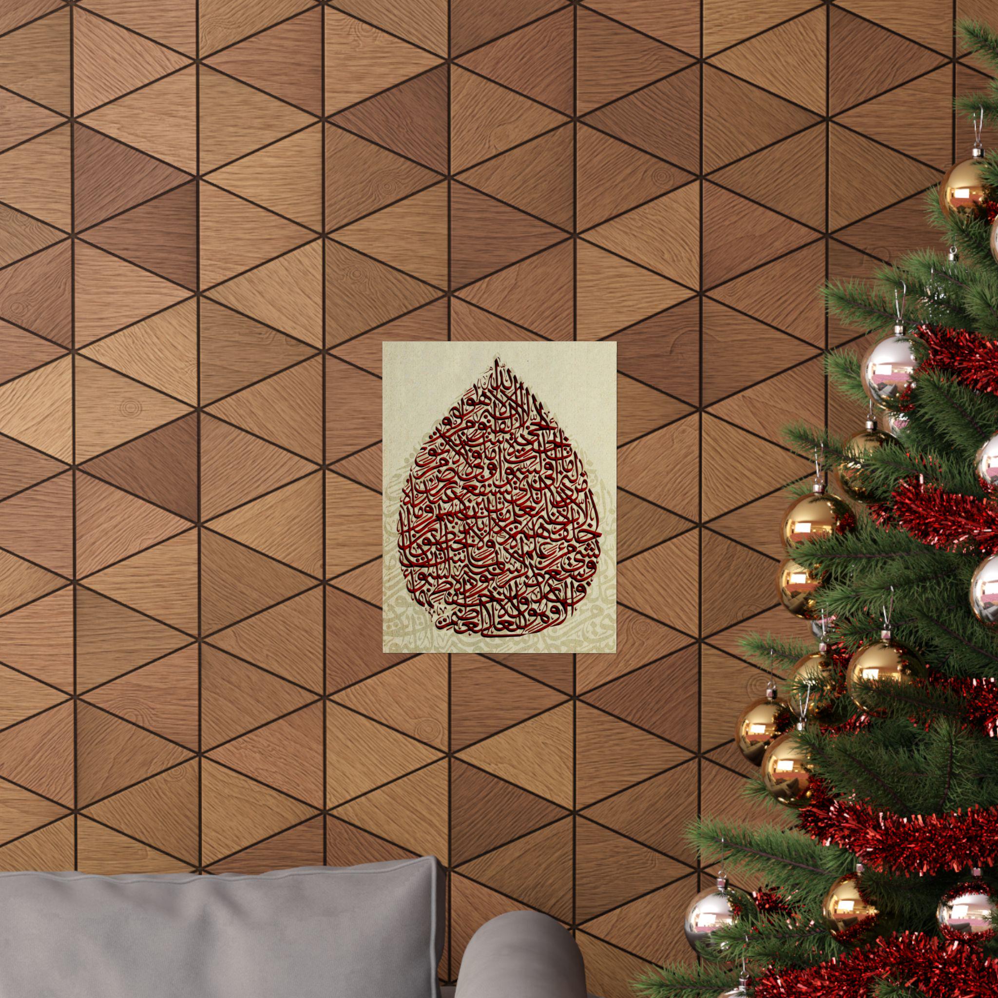 This matte vertical poster brings a calm, reverent atmosphere to any indoor space. Printed in rich giclée tones on museum-grade archival paper, the deep maroon and luminous gold calligraphy hold their clarity over time. The matte finish reduces glare while preserving the vivid, warm golds so the design reads beautifully from across a room. Sized to fit many frames (46 size options) and produced with strict archival standards, it settles into a quiet corner of a home, prayer room, or study and invites stillness each time you pass it.