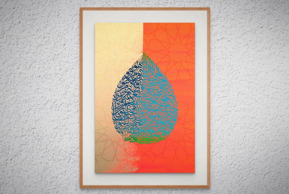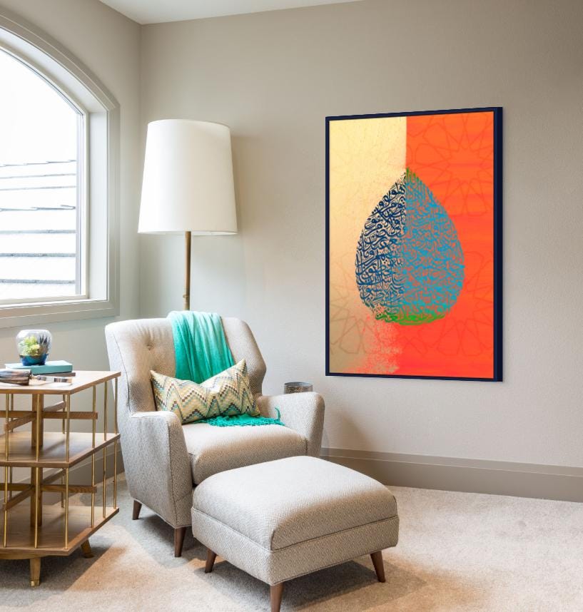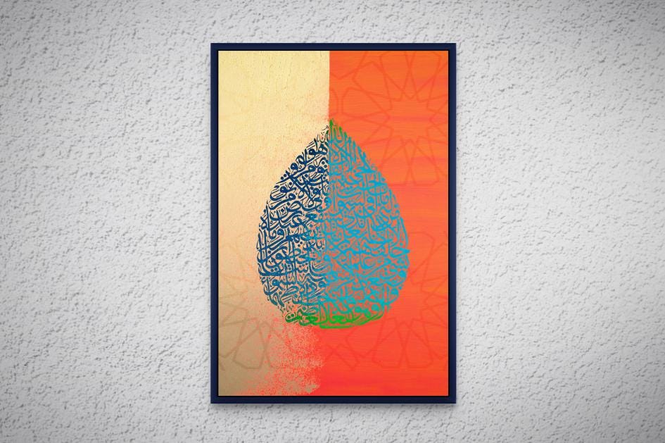 Add spiritual depth and timeless elegance to your home with this stunning Islamic wall art featuring Ayatul Kursi in intricate Arabic calligraphy, shaped into a beautiful teardrop design. Set against a rich orange background, this piece creates a warm and sophisticated ambiance — ideal for living rooms, prayer spaces, or as a meaningful gift.