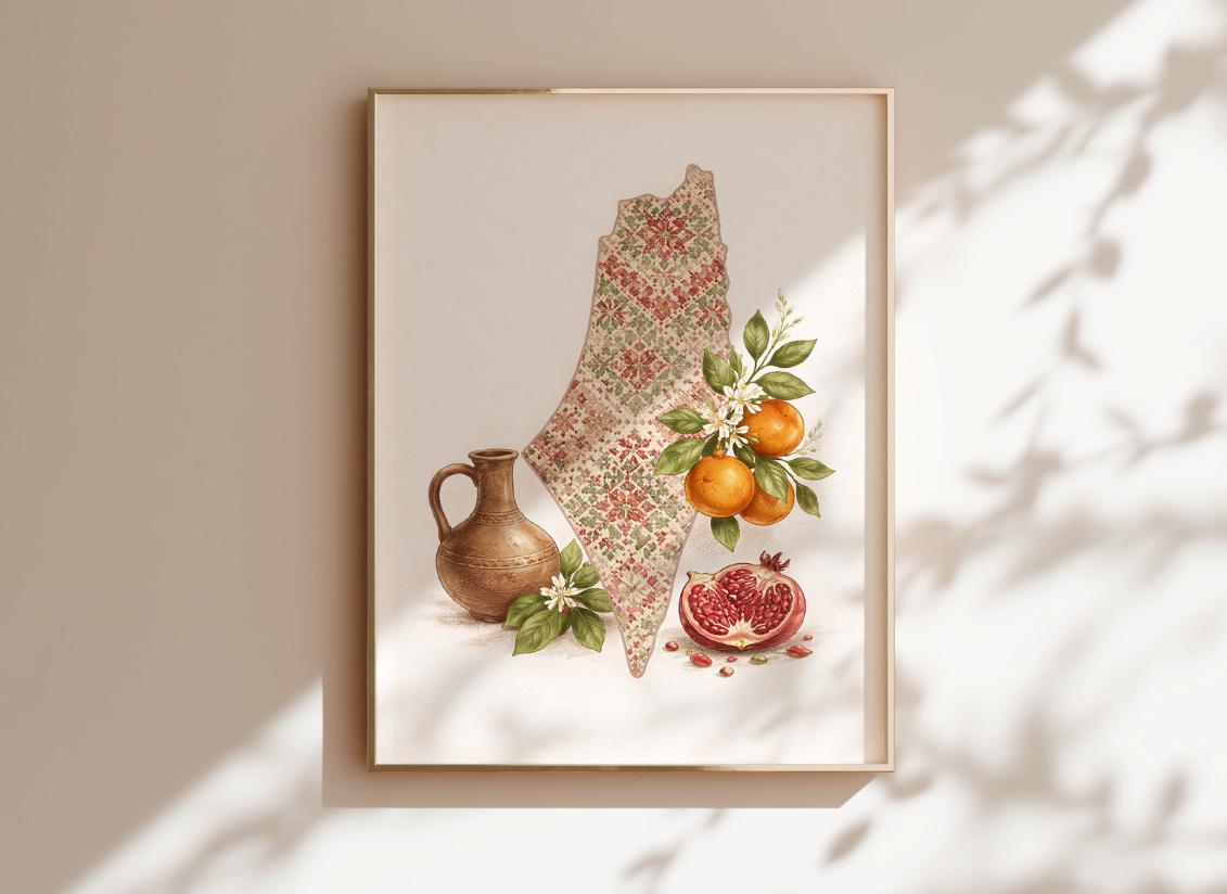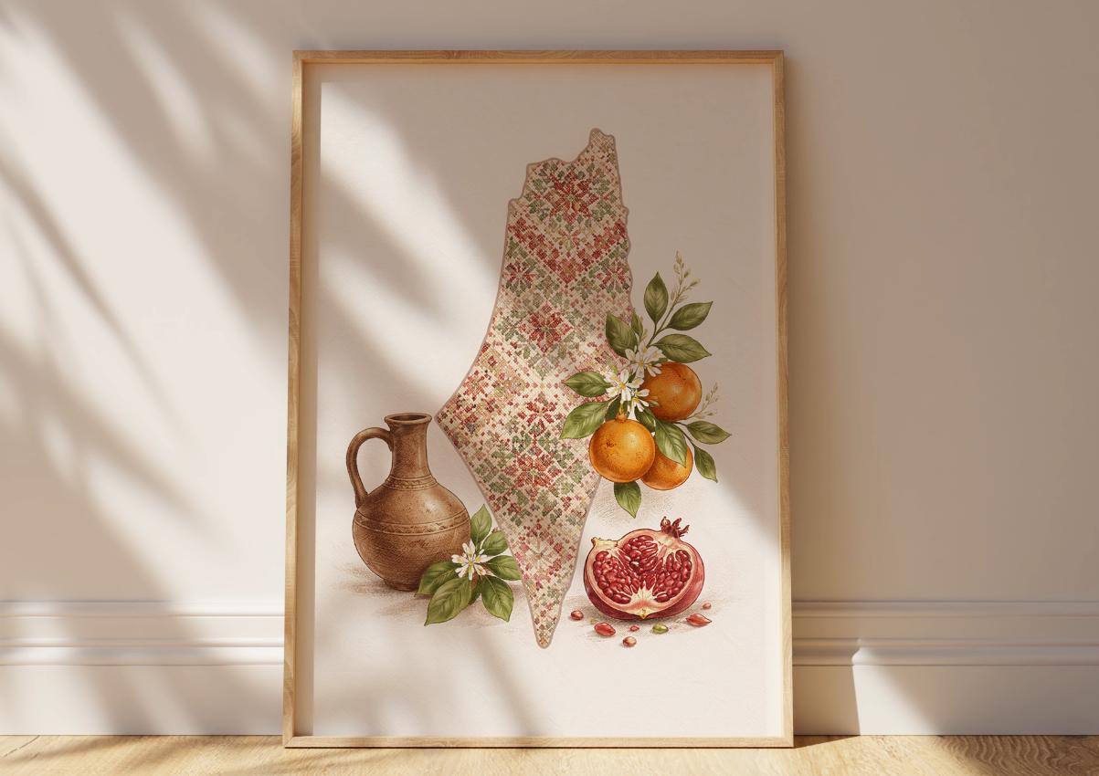 Add warmth and soul to your space with this digital art piece inspired by Palestinian tradition and nature. This modern reinterpretation of the Palestine map is filled with intricate tatreez (cross-stitch) patterns in rich earthy tones. Surrounding the map are symbols of daily life and resilience: ripe oranges with blossoms, a rustic clay jug, and a beautifully opened pomegranate.
