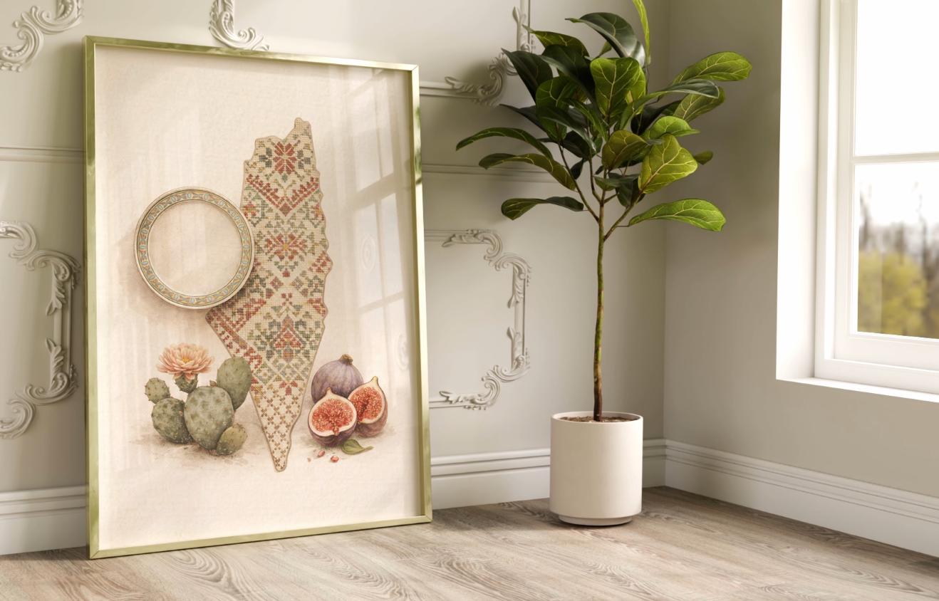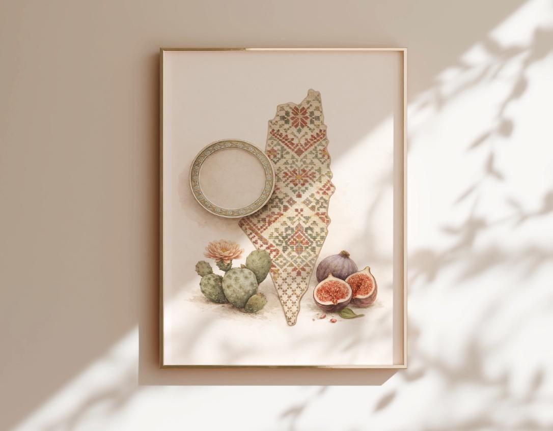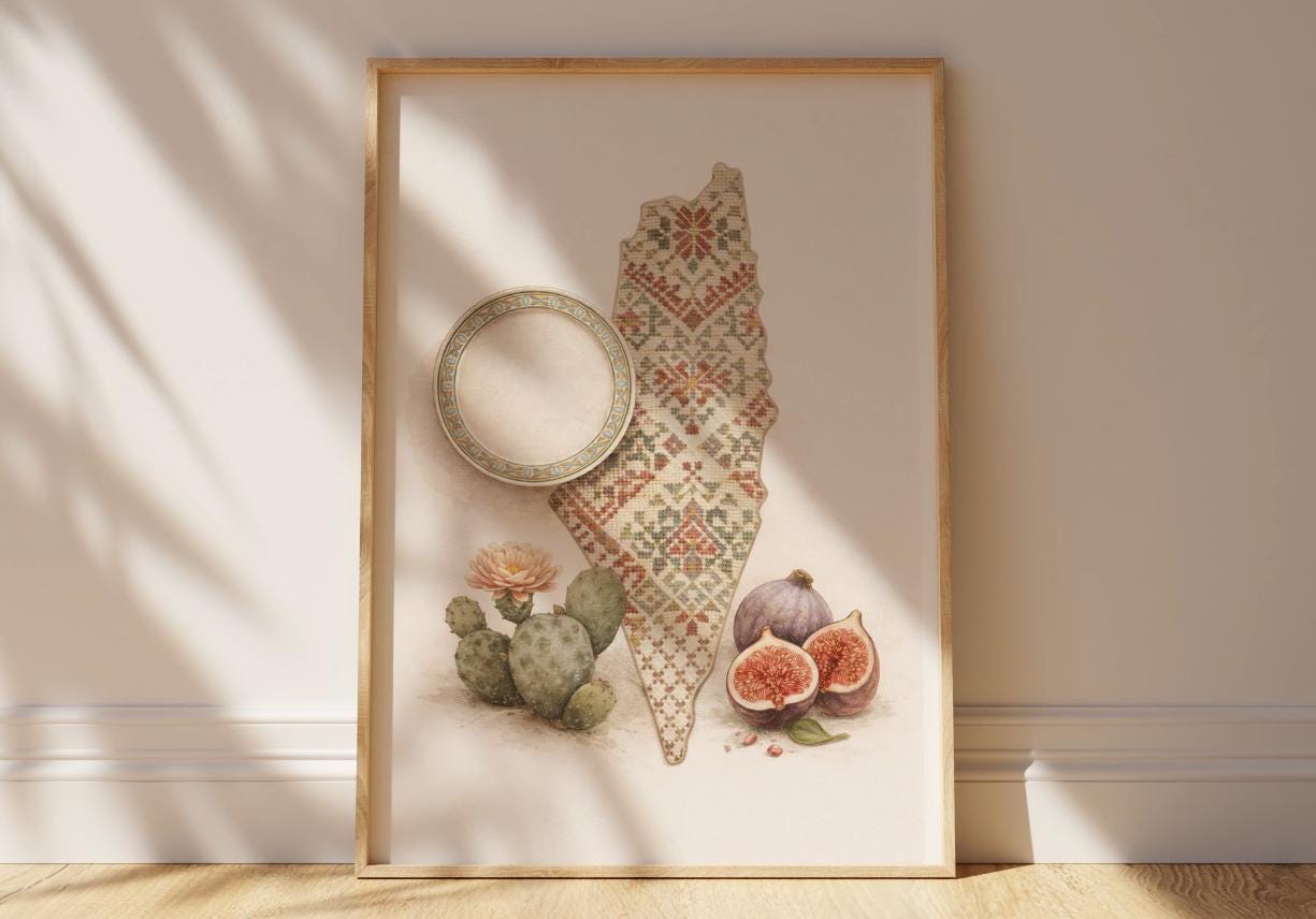 Add warmth and soul to your space with this digital art piece inspired by Palestinian tradition and nature. This modern reinterpretation of the Palestine map is filled with intricate tatreez (cross-stitch) patterns in rich earthy tones. Surrounding the map are symbols of daily life and resilience: ripe native cactus', a rustic ceramic plate, and a beautifully opened fig.