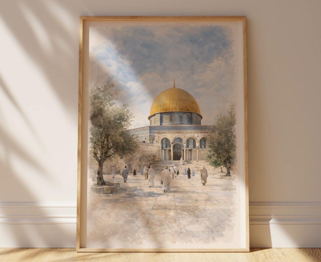 Bring spiritual serenity and cultural elegance into your home with this digital watercolor-style artwork of Masjid Al-Aqsa, one of Islam’s most sacred landmarks. Set in the heart of Jerusalem, this detailed piece captures the iconic golden Dome of the Rock and surrounding architecture in soft, earthy hues and textured brushstrokes.