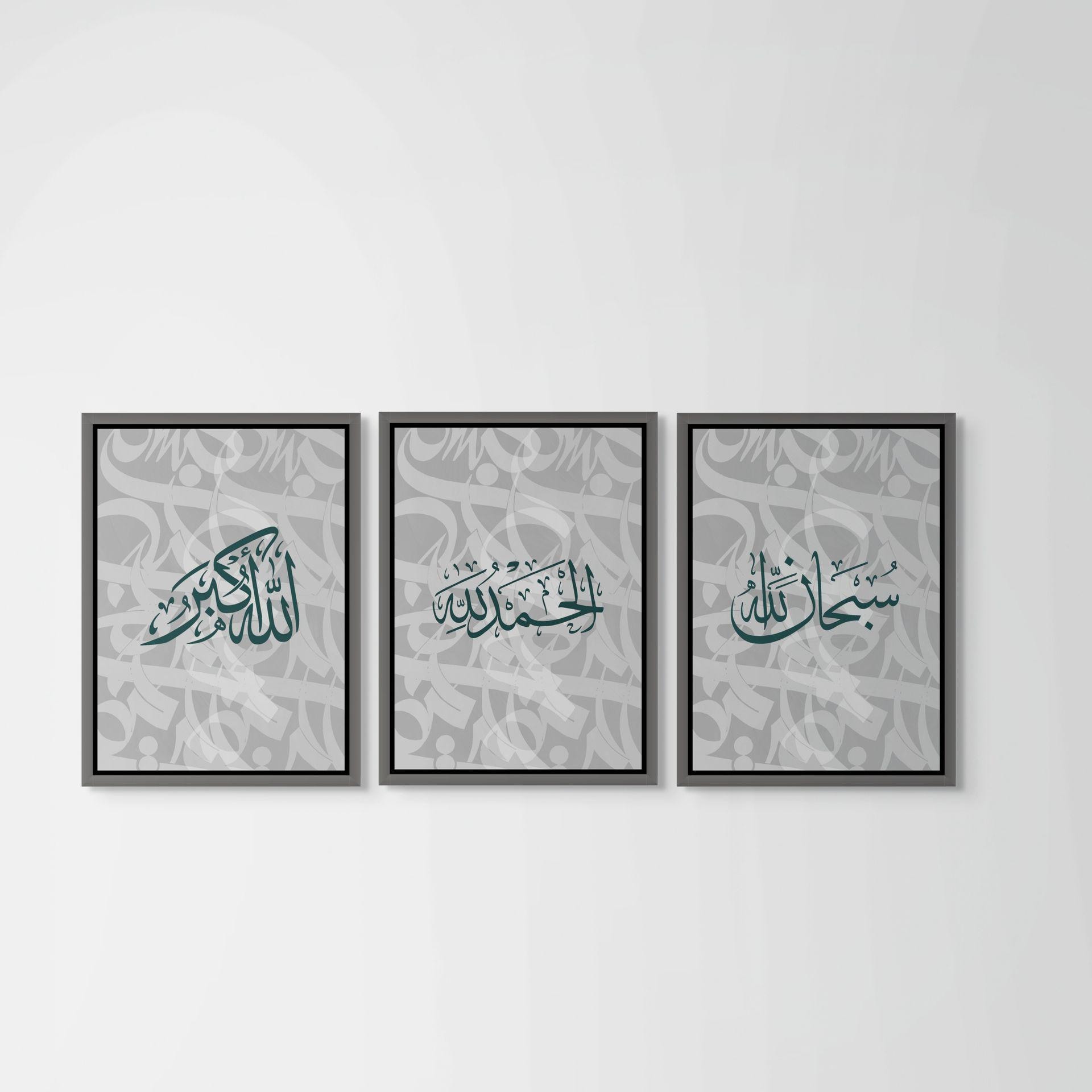 Elevate your home with this elegant trio of Islamic wall art, blending traditional Arabic calligraphy with contemporary abstract design. Each print features one of the beloved dhikr phrases — SubhanAllah, Alhamdulillah, Allahu Akbar — beautifully set against a backdrop of dynamic, layered calligraphic textures.