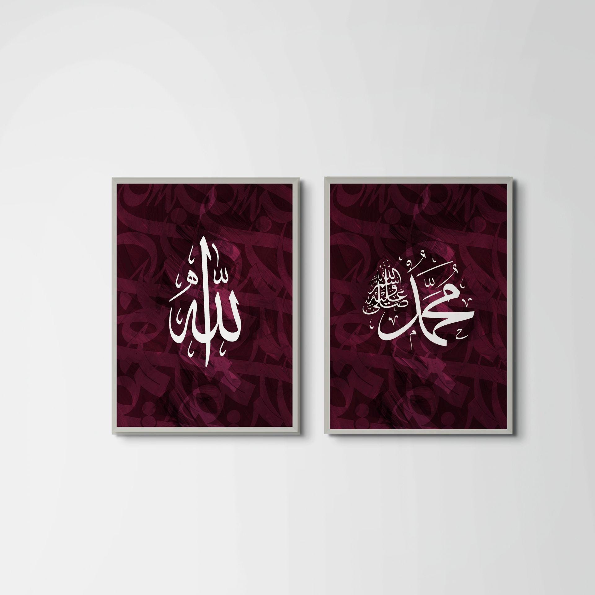 Elevate your home with this elegant duo of Islamic wall art, blending traditional Arabic calligraphy with contemporary abstract design. Each print features one of the beloved Allah and Muhammad SAW — beautifully set against a backdrop of dynamic, layered calligraphic textures.