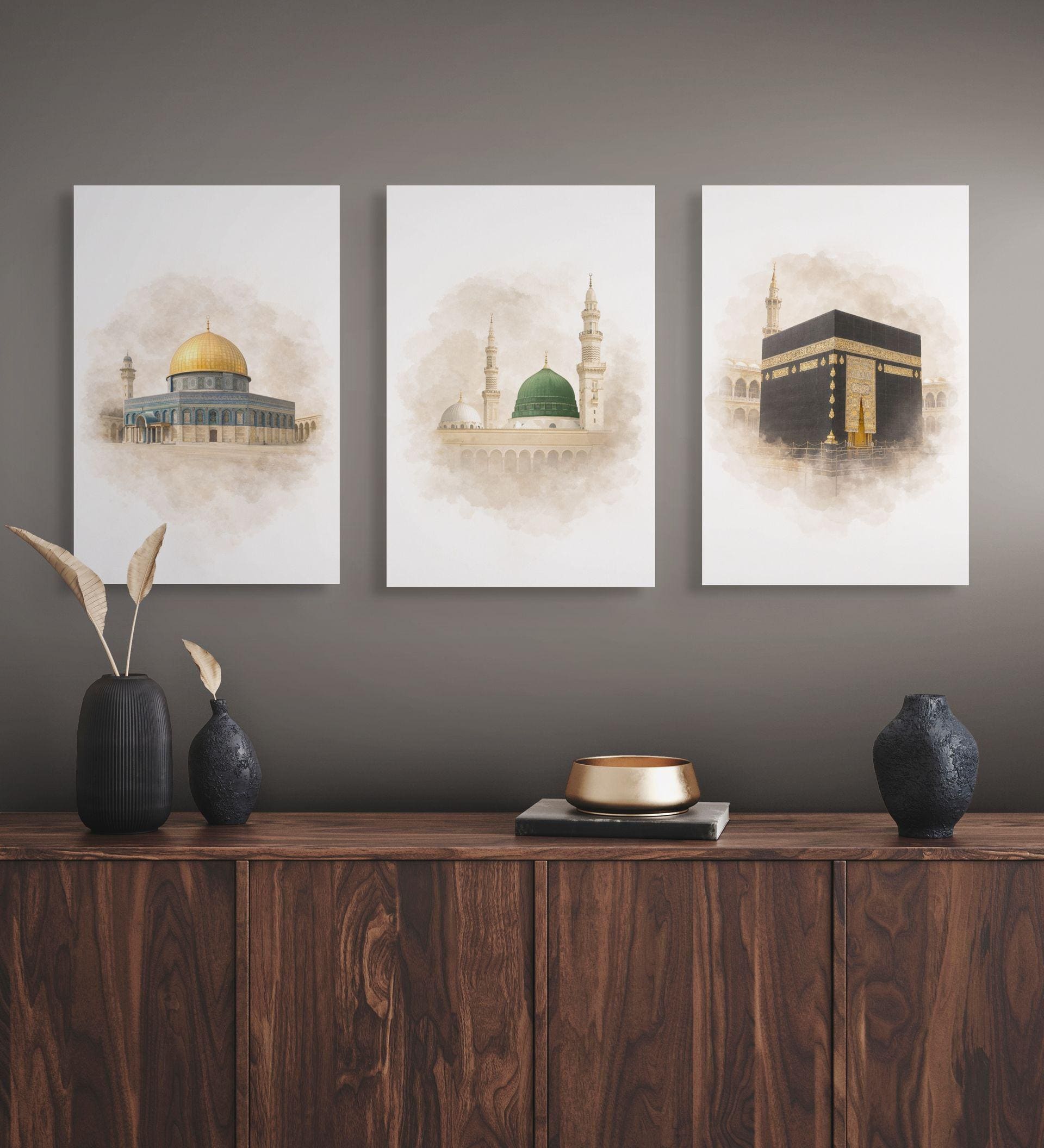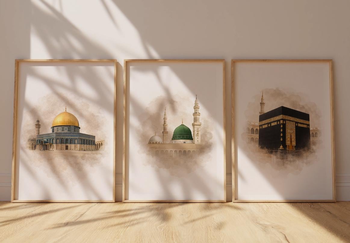 Enhance your home with our Set of 3 Islamic Posters, featuring stunning depictions of Kaaba in Mecca, Masjid an-Nabawi in Medina, and Al Aqsa with the iconic Dome of the Rock in Jerusalem. This Islamic Poster collection is perfect for Muslim wall art, offering a beautiful blend of spirituality and artistry. Each poster captures the essence and grandeur of these revered sites, making them a meaningful addition to your decor. Celebrate your faith and adorn your walls with this captivating set, bringing a touch of sacred beauty and inspiration to your living space.