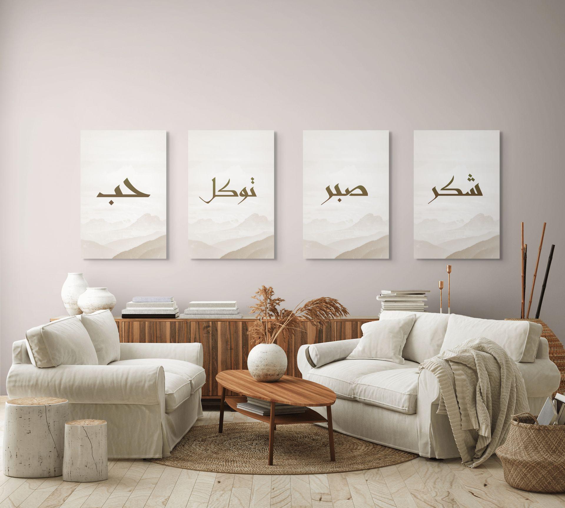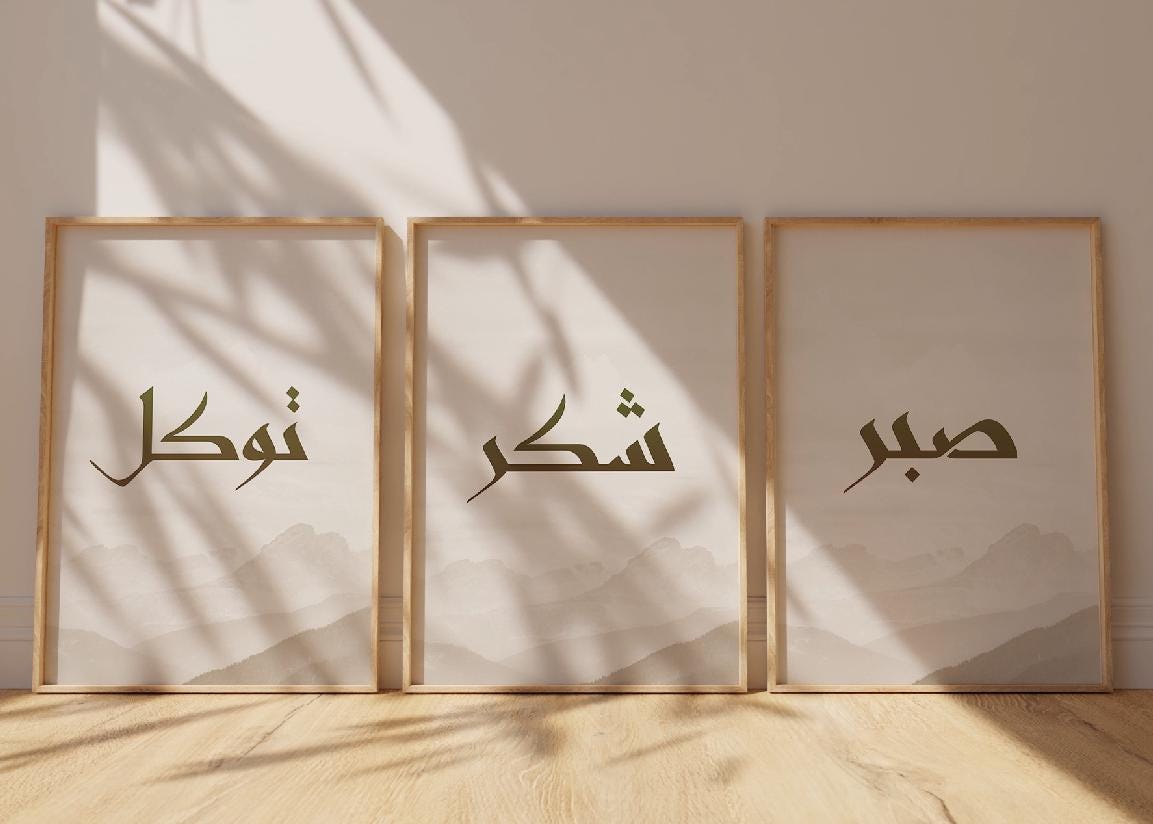 Enhance your home with our Set of 4 Islamic Posters, featuring stunning calligraphy of Shukr (Thanks), Sabr (Patience), Tawakul (Trust in Allah) and Hubb (Love). This Islamic Poster collection is perfect for Muslim wall art, offering a beautiful blend of spirituality and artistry. Each poster captures essence and grandeur, making them a meaningful addition to your decor. Celebrate your faith and adorn your walls with this captivating set, bringing a touch of sacred beauty and inspiration to your living space.