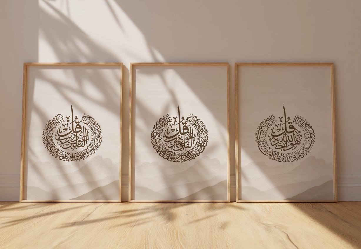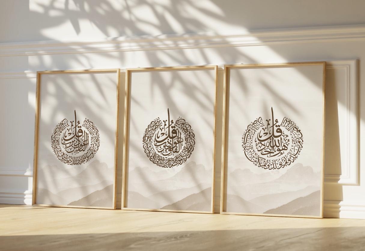 Elevate your home with this elegant trio of Islamic wall art, blending traditional Arabic calligraphy with contemporary abstract design. Each print features one of the beloved Surahs— The Three Quls — beautifully set against a backdrop of dynamic, layered calligraphic textures.