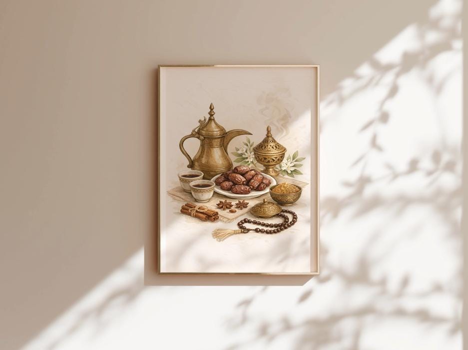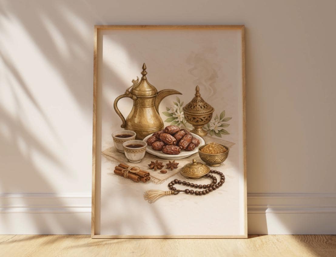Add warmth and soul to your space with this digital art piece inspired by Palestinian tradition and nature. This interpretation of the iconic Palestinian gahwa pot with intricate tatreez (cross-stitch) patterns in rich earthy tones. Surrounding the coffee pot are symbols of daily life and resilience: ripe dates, incense, and cinnamon sticks.