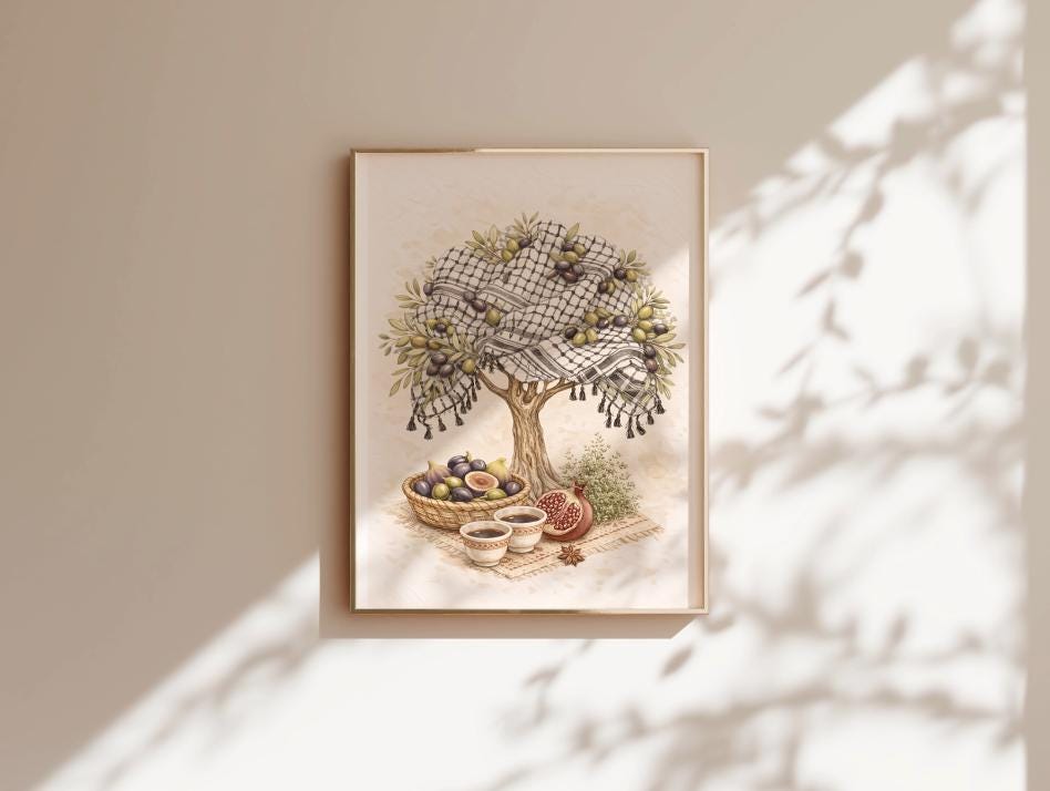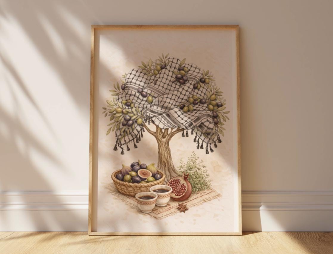 Add warmth and soul to your space with this digital art piece inspired by Palestinian tradition and nature. This reinterpretation of a Palestine keffiyeh wrapped around an olive tree laid down with intricate tatreez (cross-stitch) patterns in rich earthy tones. Surrounding the tree are symbols of daily life and resilience: 2 coffee cups, a basket of olives and a beautifully opened pomegranate.